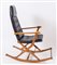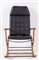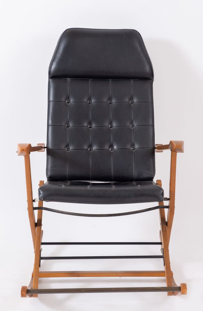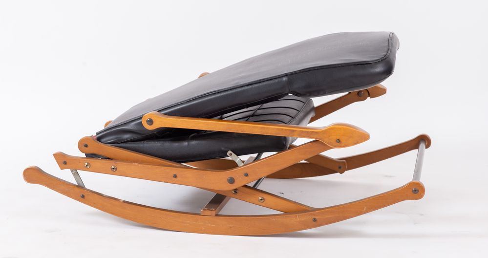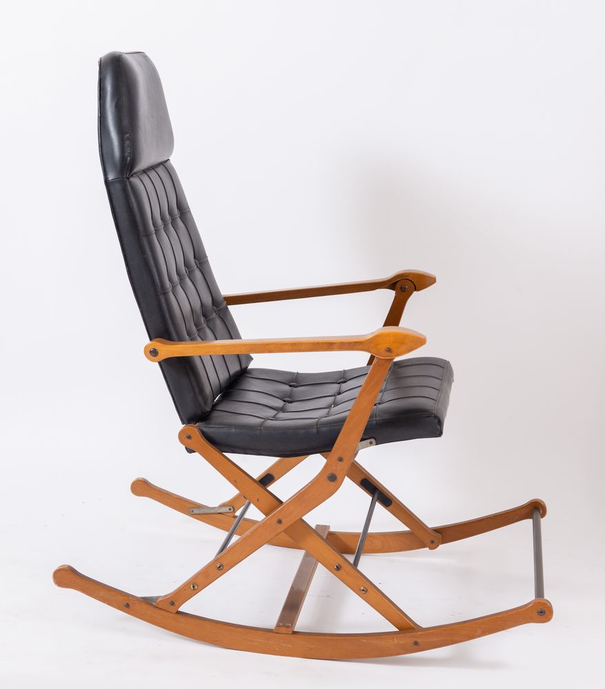 Sedia a dondolo pieghevole con struttura in legno e imbottitura in polietilene foderato in pelle. Prod. Italia, 1960 ca. Cm 106x67x92.