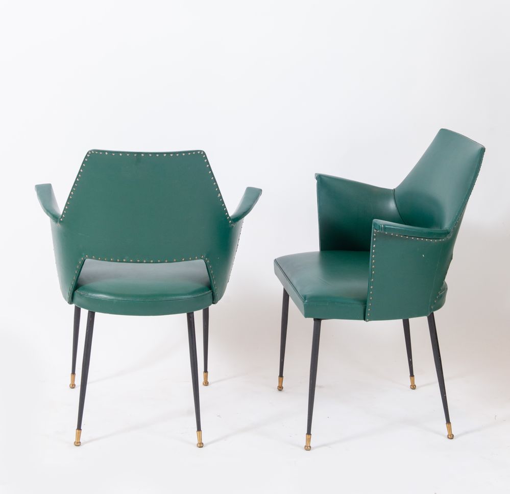 Coppia di sedie con struttura in metallo e legno e rivestimento in pelle. Lievi difetti. Prod. Italia, 1950 ca. Cm 83x50x65.