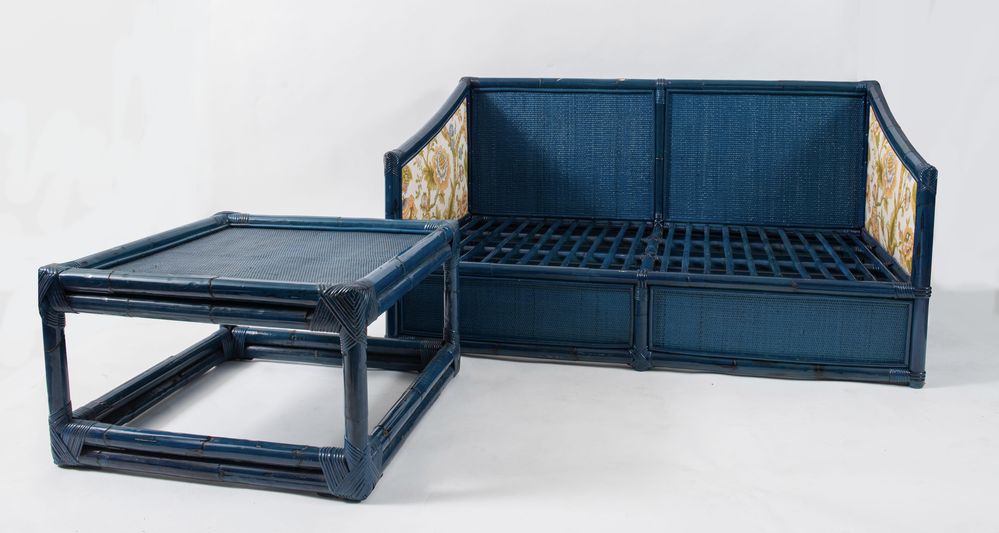 Divano a due posti con tavolino da caffè. Prod. Vivai del Sud, Italia, 1970 ca. Cm 147x77x82 e Cm 68x68x41
