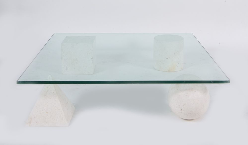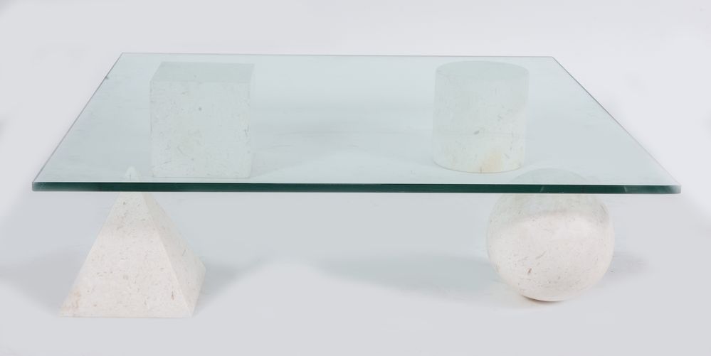 Tavolino da salotto modello Metafora. Basi in marmo travertino e piano in vetro. Prod. Casigliani, Italia, 1979 Cm 24x97x97.