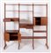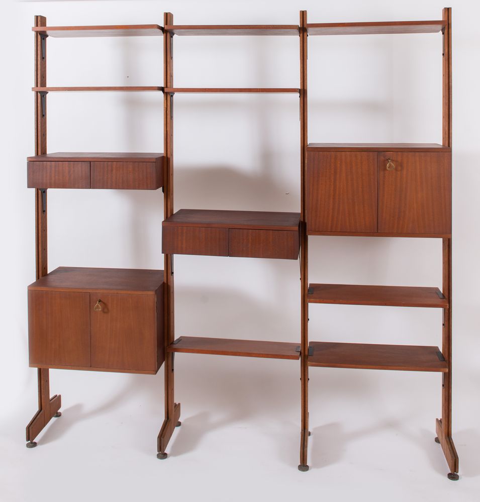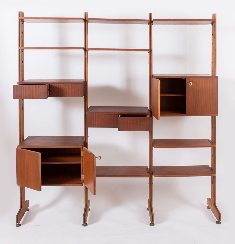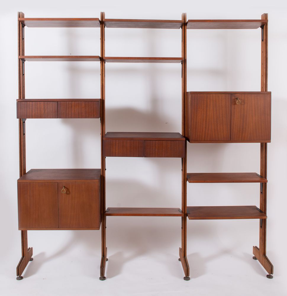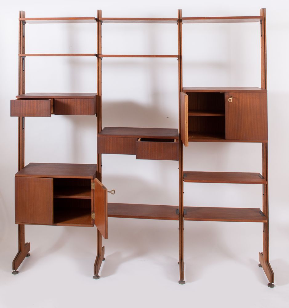 Libreria modulare con struttura in legno e metallo e piani in legno. Prod. Italia, 1960 ca. Cm 210x40x200.