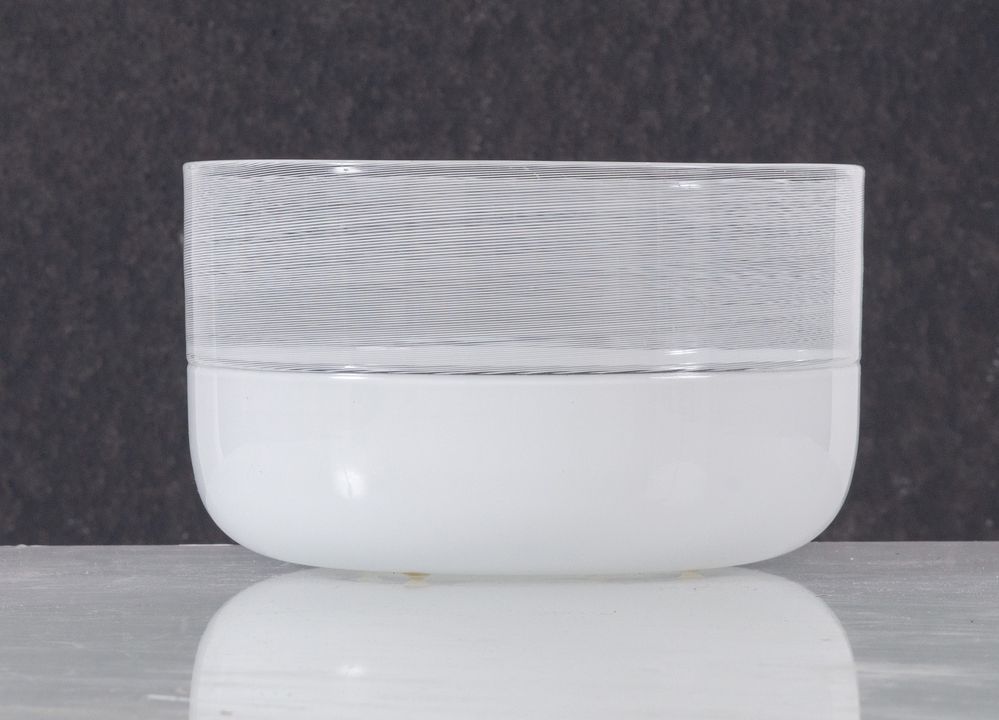 Ciotola in vetro soffiato della serie ‘filigrane di Tapio’. Firma alla base ‘Venini Italia TW’. Prod. Venini, 1960 ca. Cm 12x20x20.