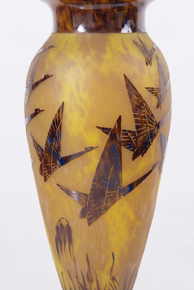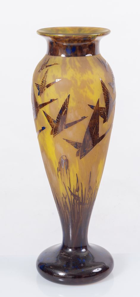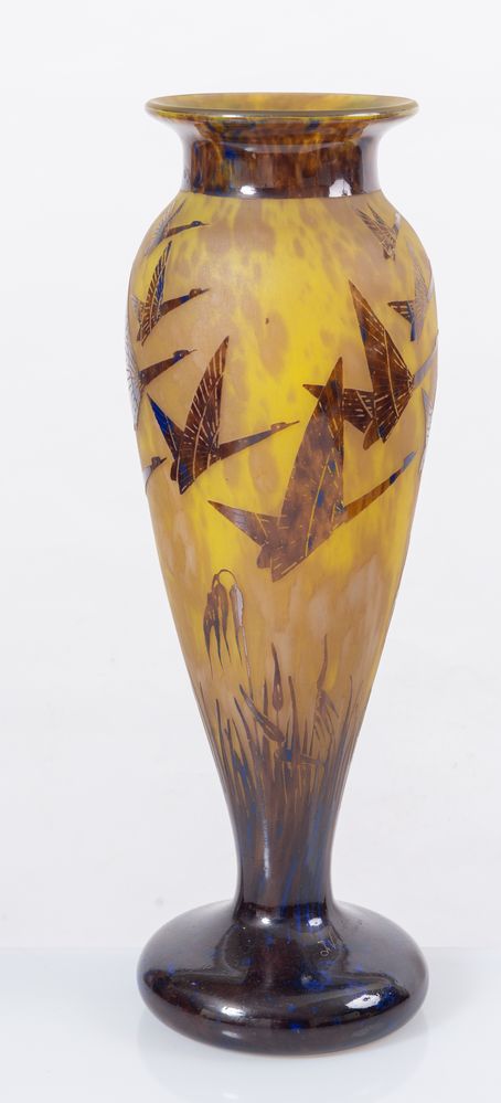 Vaso in vetro soffiato cammeo modello Halbrans. Firma incisa. Prod. Le Verre Francais, Francia, 1920 ca. Cm 55x20x20.