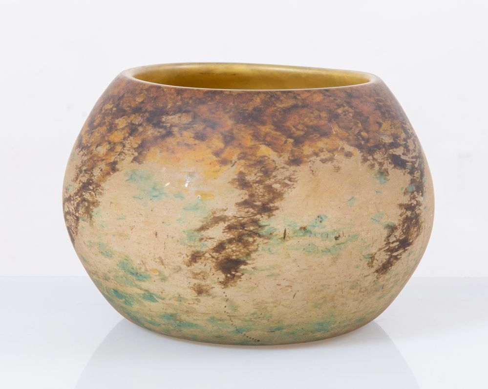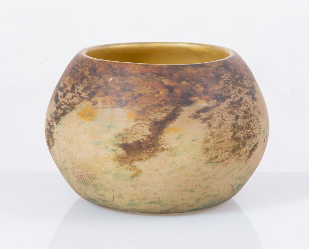 Ciotola in vetro soffiato cammeo. Marchio originale. Prod. Daum & Nancy, Francia, 1900 ca. Cm 15x24x24.