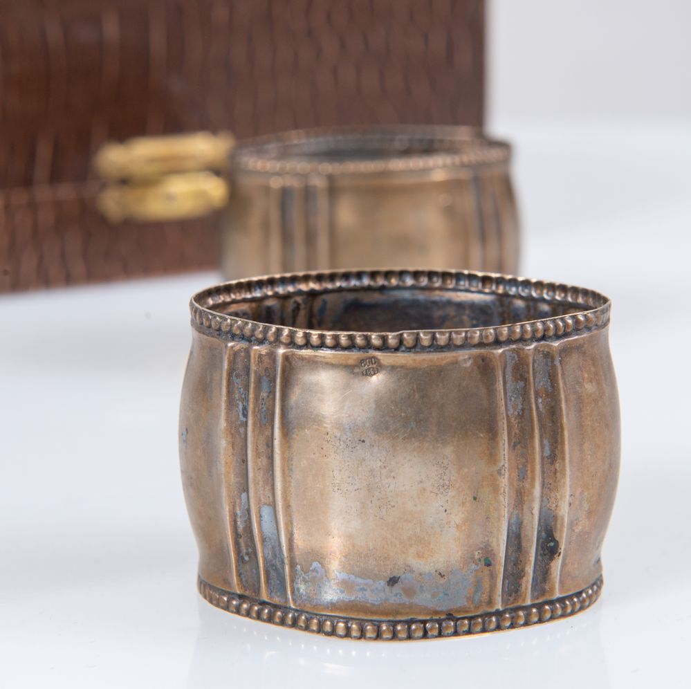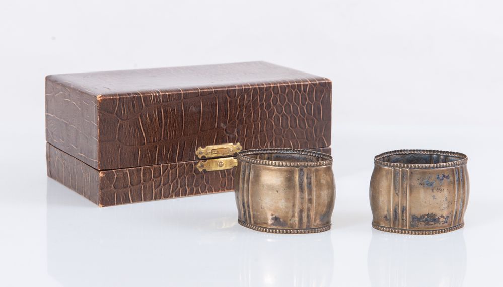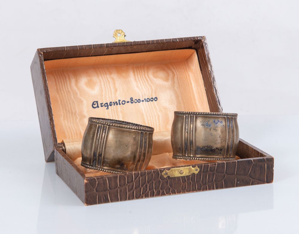 Italia, XX secolo. Coppia di portatovaglioli in argento 800 con la scatola...
