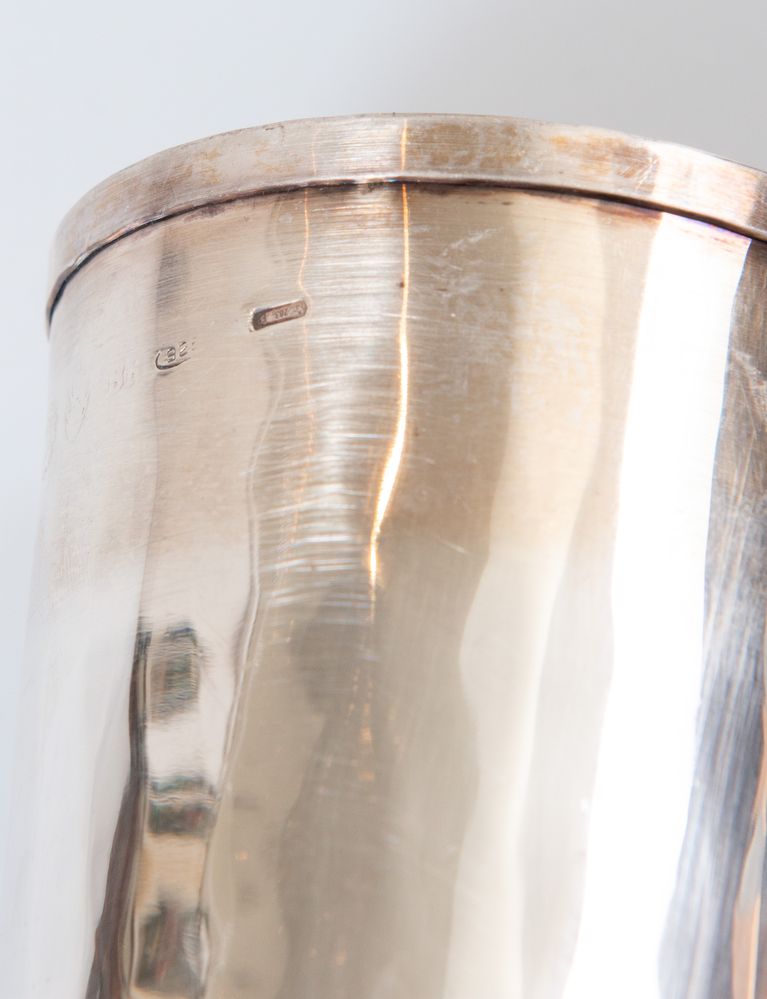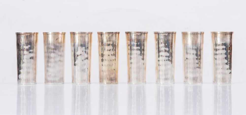 BRANDIMARTE, Firenze, XX secolo. Lotto composto da otto bicchieri in argento 925. Sul bordo superiore recano punzoni: stemma dell'argentiere BR, 925 e losanga locatica 283FI. Cadauno di cm 12,5x Ø 5,5. Peso 827 gr.