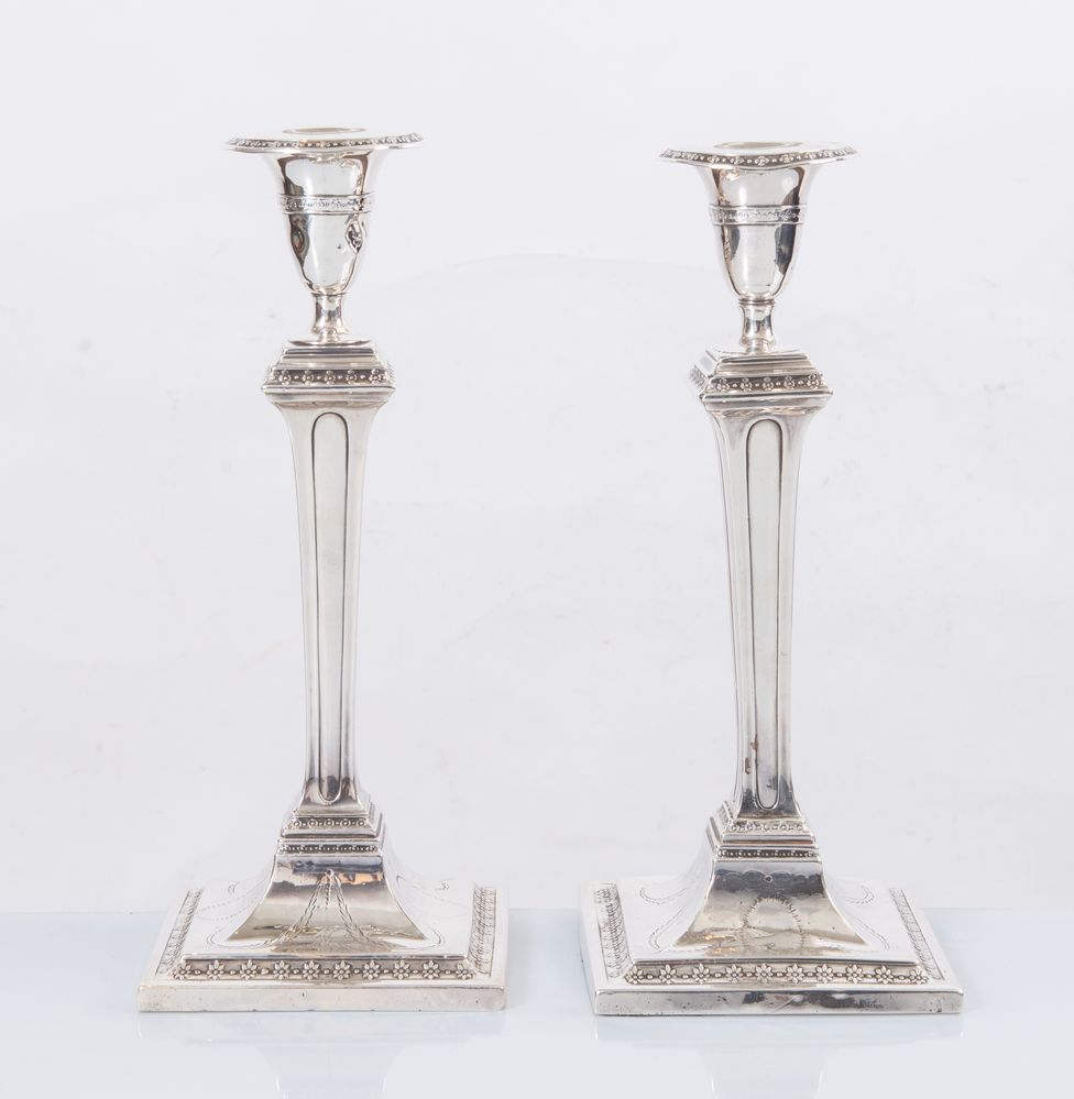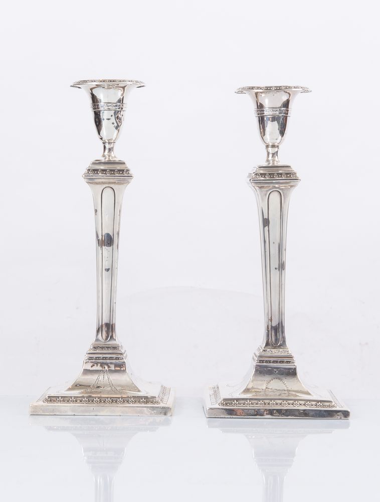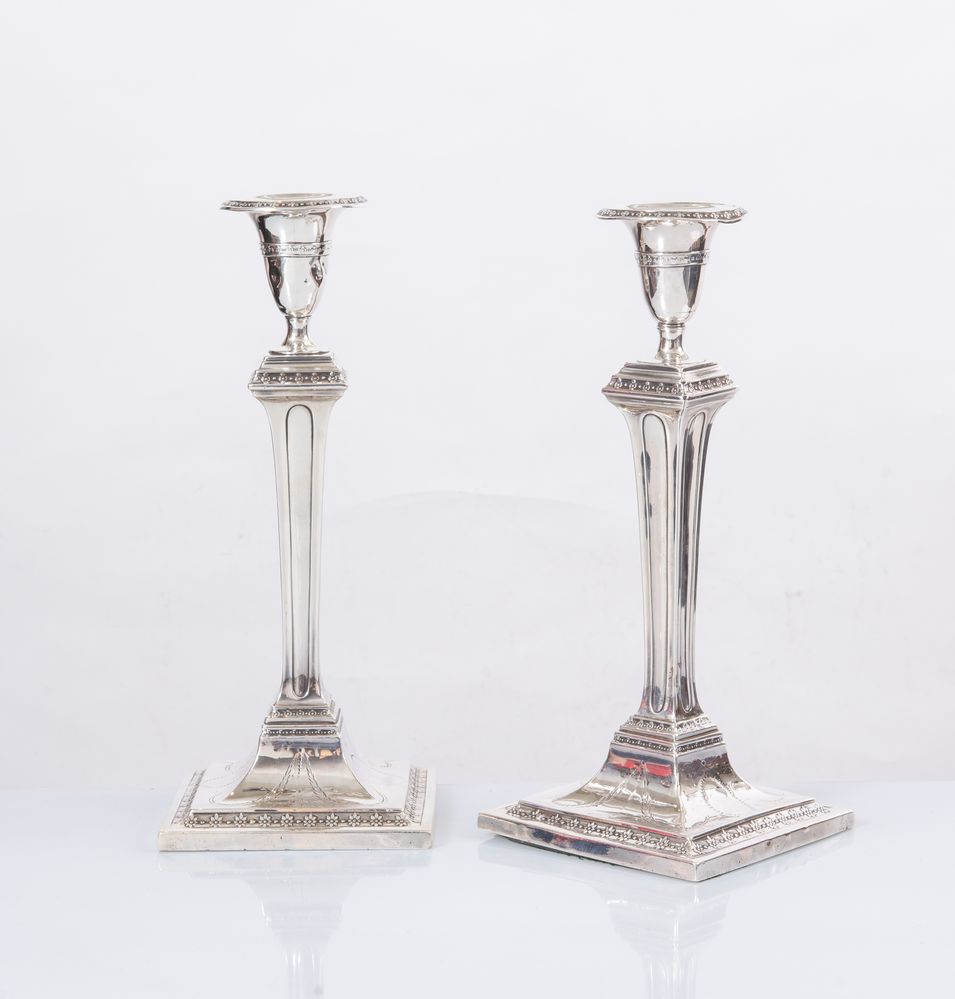 Argentiere TD, Sheffield, Inghilterra. Coppia di candelabri in argento 925. Reca punzoni: sigla dell’argentiere TD, leone passant, corona e lettera dataria non leggibile. Cadauno di cm 29,5x12,5x12,5. Peso complessivo, senza rinforzo: 814 gr. ca.