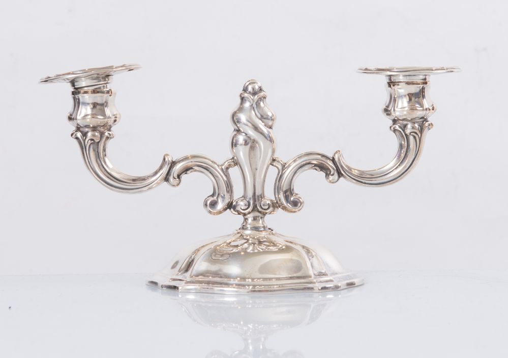 Italia, XX secolo. Candelabro in argento 800 a doppio braccio. Sotto la base...
