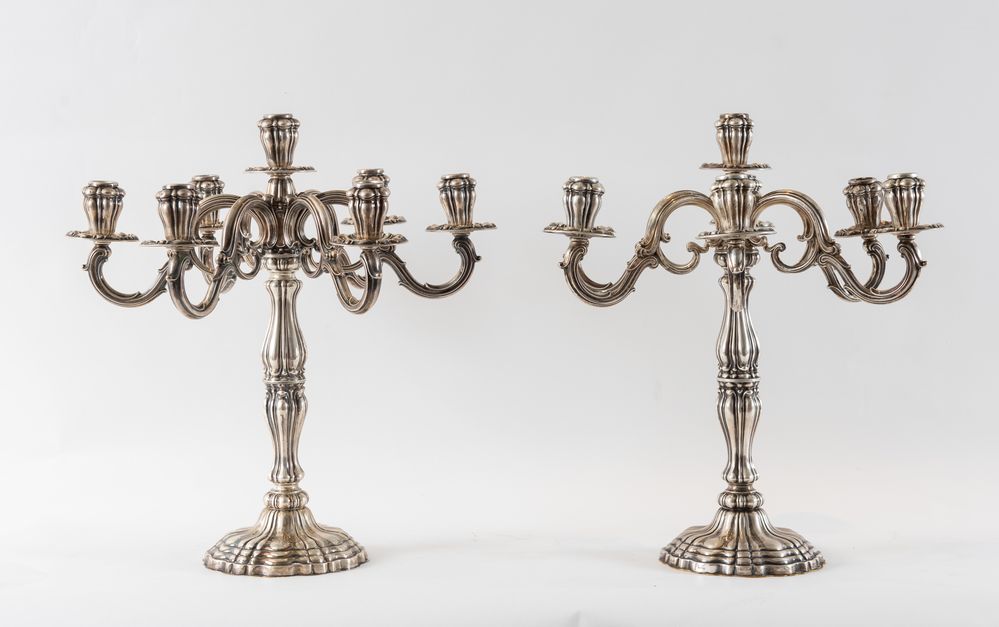 Ricci&c s.p.a., Alessandria, XX secolo. Coppia di candelieri in argento 800. Sul bordo inferiore recano punzoni: 800, stemma dell'argentiere, losanga locativa 20AL. Cm 46,5x46,5x46,5. Peso complessivo dell'argento: 2500 gr ca.