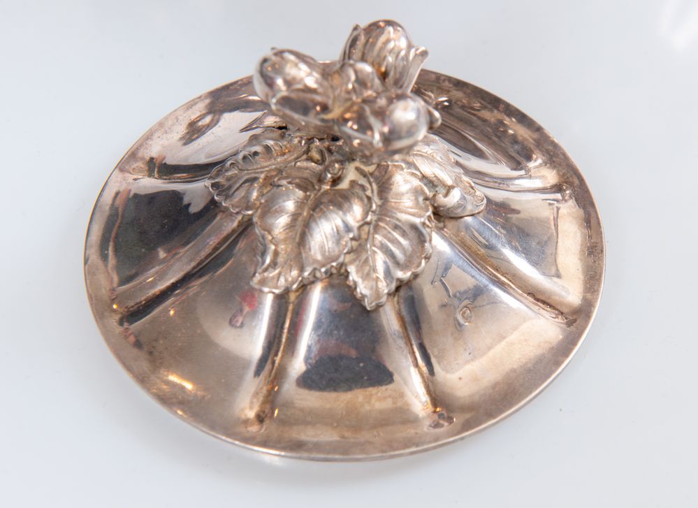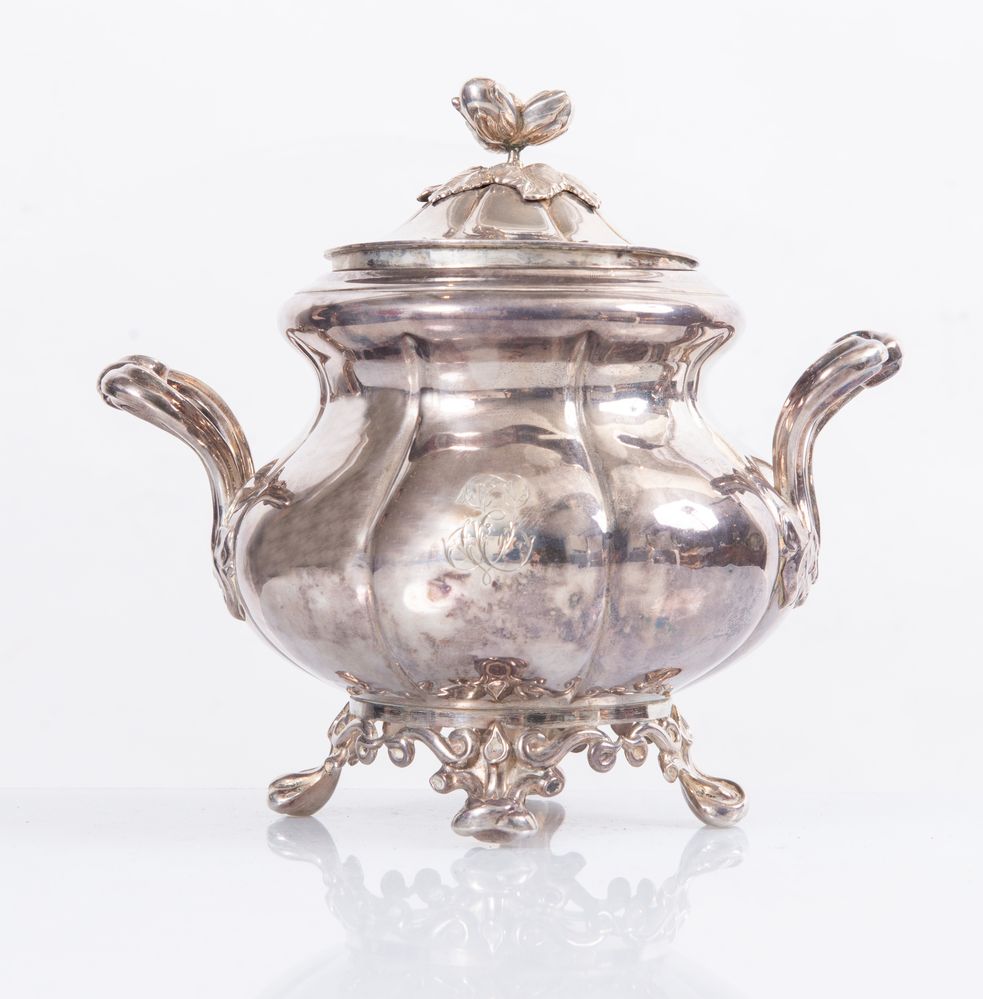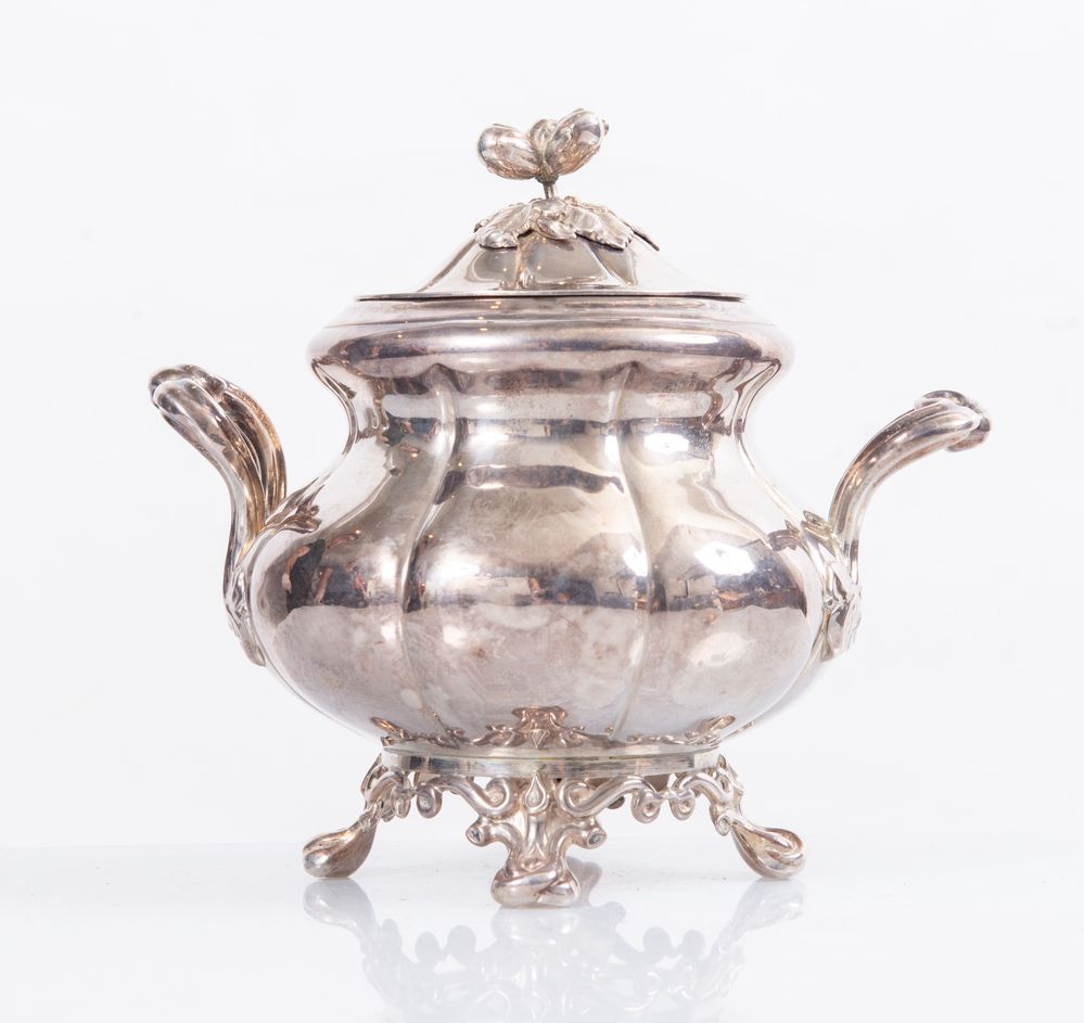 DEBAIN, Parigi (?), fine del XIX secolo. Zuccheriera in argento. Sotto la base, sotto il coperchio e sul bordo superiore reca punzoni: stemma dell’argentiere Debain e punzone non identificato. Cm 17,5x19,5x13,5. Peso: 401 gr.