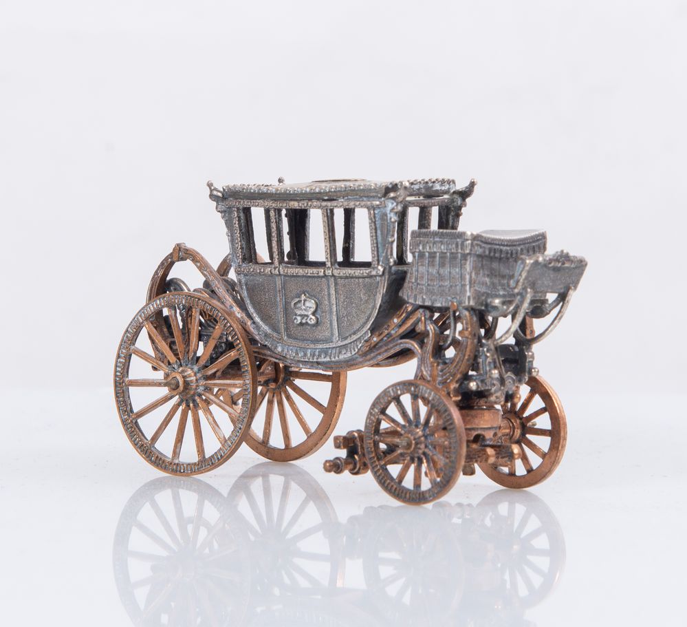 Carrozza in argento e metallo dorato. Sotto la base reca punzoni. Cm...