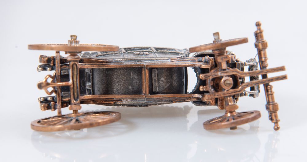 Carrozza in argento e metallo dorato. Sotto la base reca punzoni. Cm 5,2x8,5x3. Peso tot:105 gr