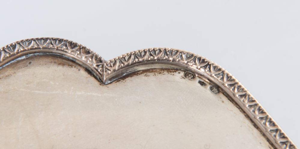 Italia, XX secolo. Alzata in argento 800. Sul bordo superiore reca punzoni: 800, losanga locativa non leggibile e 800. Cm 5,5x24,4x23. Peso: 423 gr.