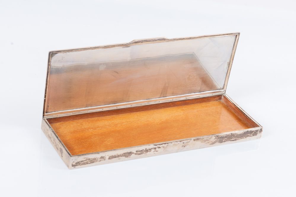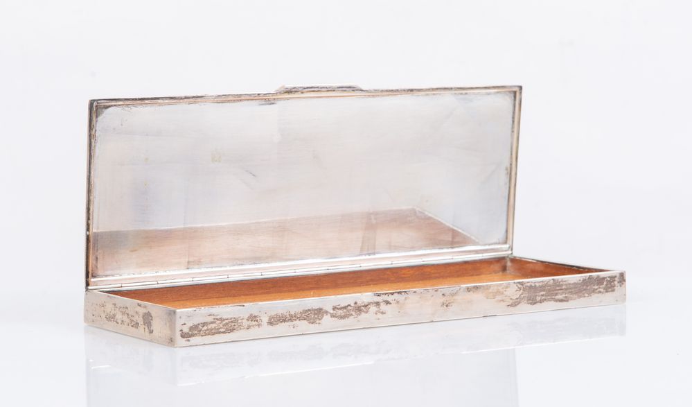 Firenze, XX secolo. Scatola in argento 800 con base lignea. Sul coperchio reca punzoni 800 e losanga locativa fiorentina. Cm 1,8x24,9x9,3. Peso complessivo: 394 gr.