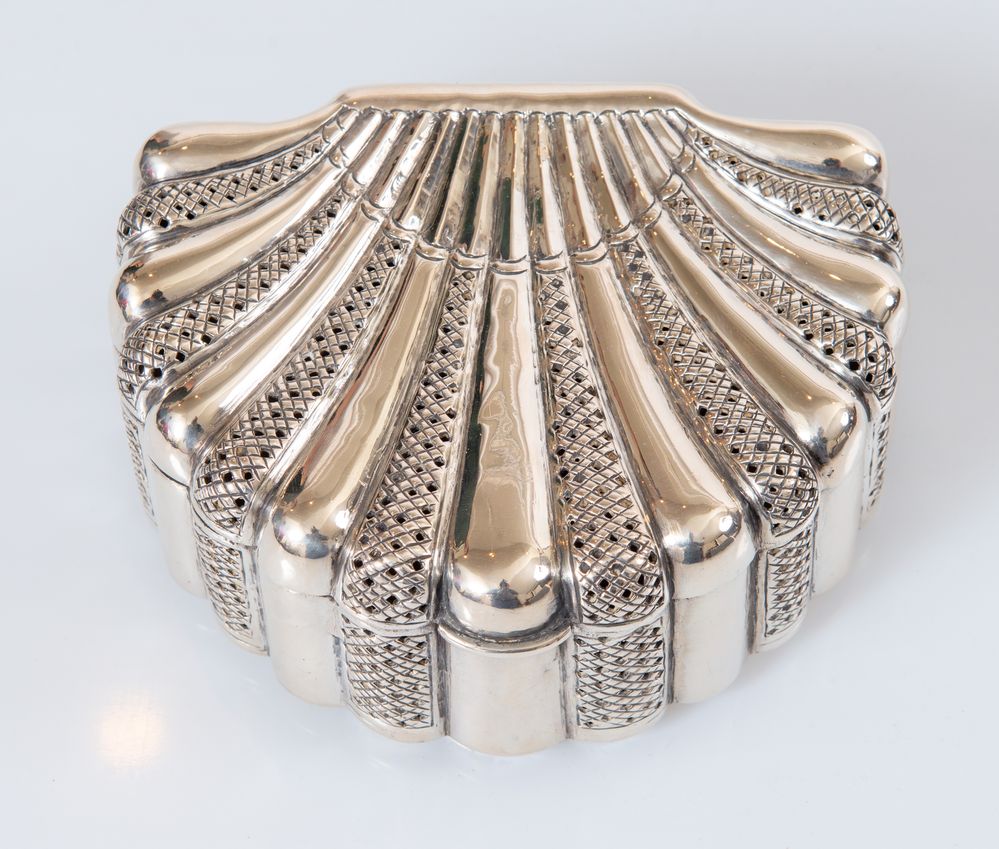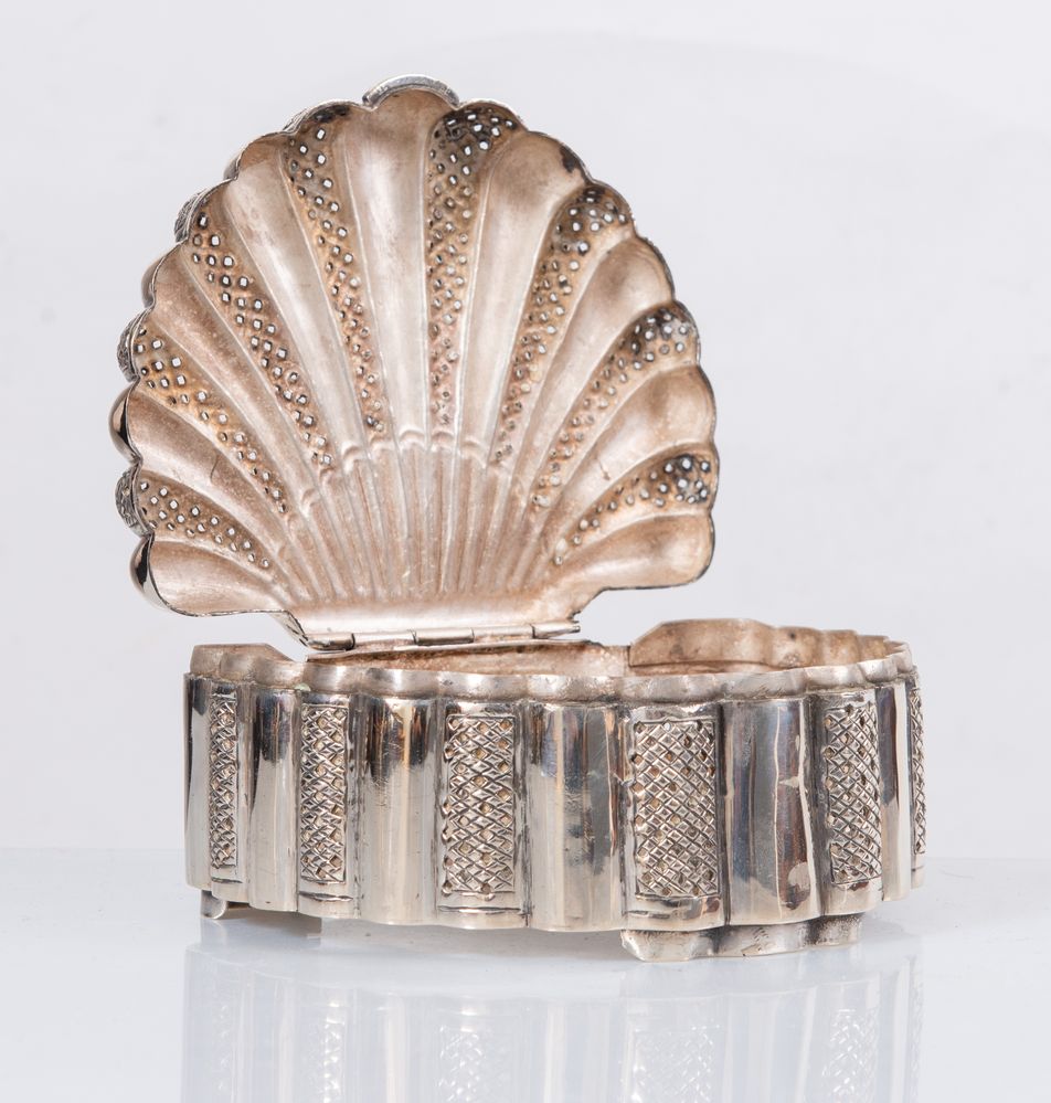 Scatola a forma di conchiglia in argento 925. Reca punzone: 925. Cm...