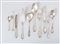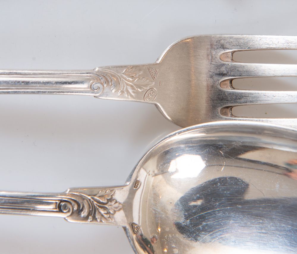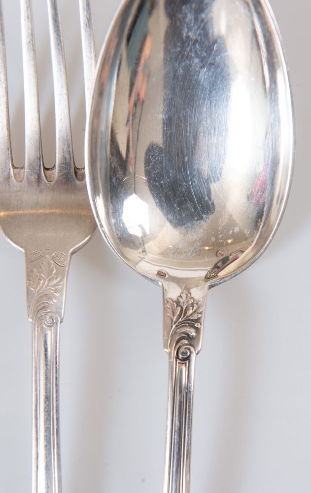 FABBRICA ARGENTERIA CLEMENTI dì GIOVANNI MANTEL & C., Bologna, XX secolo. Servizio di posate in argento 800 composto da: dodici coltelli grandi, undici coltelli piccoli, dodici forchette, diciassette forchette, tredici forchettine, sedici cucchiai, quattro cucchiaini e quattro posate da portata. Sul manico recano punzoni: stemma dell'argentiere, 800 e losanga locativa 1BO. Peso complessivo: 6156 gr.