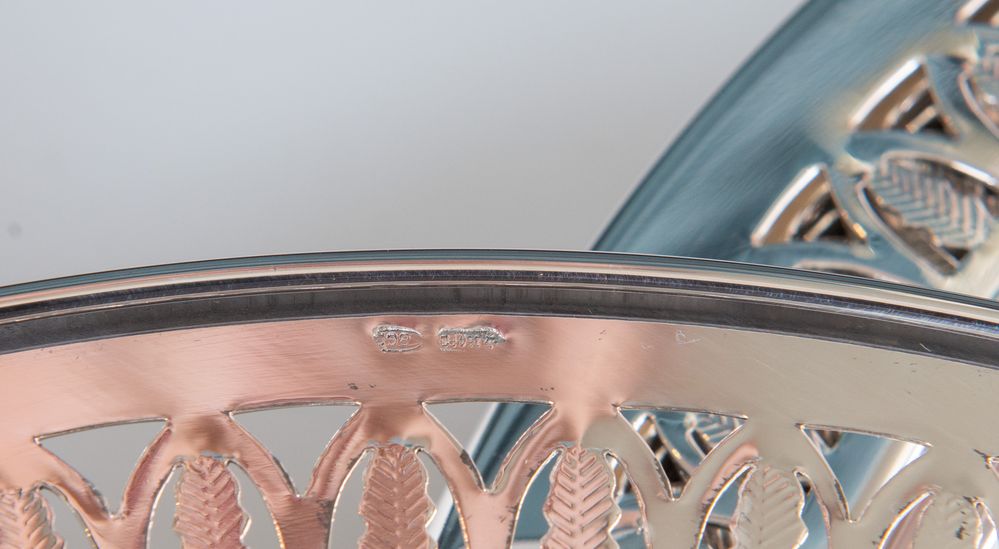 Padova, dal 1968. Set da ventotto piatti in argento 800. Lotto composto da quattordici piatti normali e quattordici piatti da frutta. Recono punzoni: 800 e losanga locativa 354PD. Piatti piccoli: Ø 22,9; piatti grandi: Ø 29,5. Peso complessivo: 9.660 gr ca.
