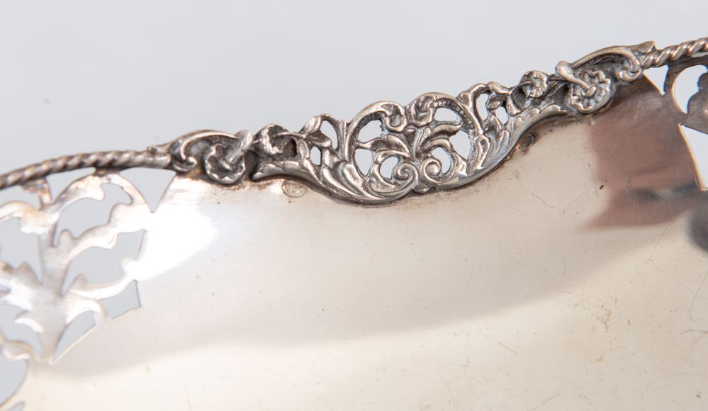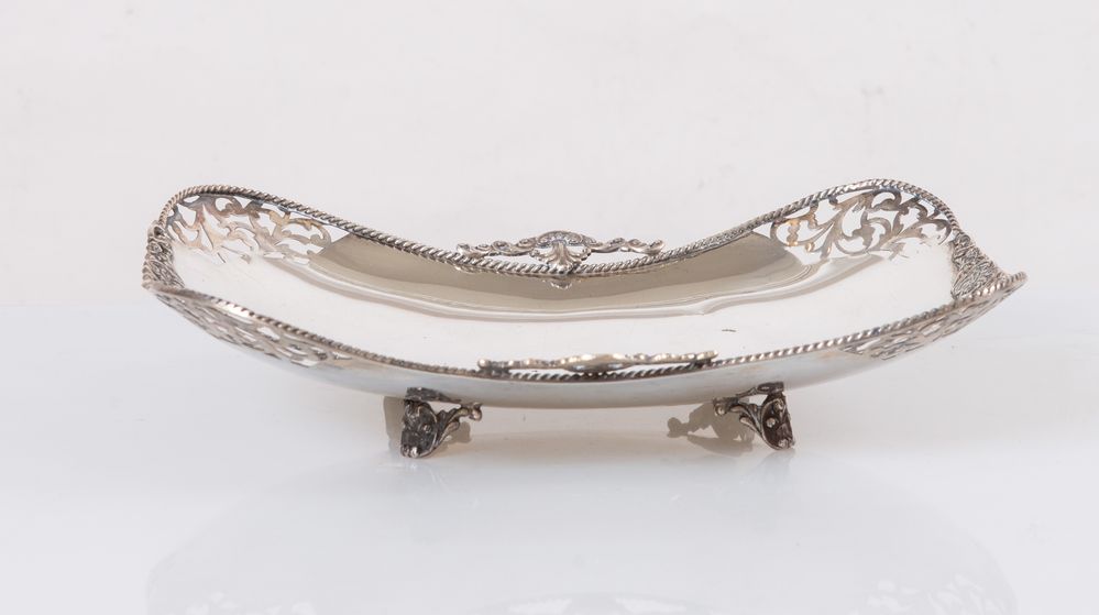 Italia, XX secolo. Alzata in argento 800. Sul bordo superiore reca punzoni: 800 e losanga locativa non leggibile. Cm 6x26,6x20. Peso: 388 gr. (difetti)