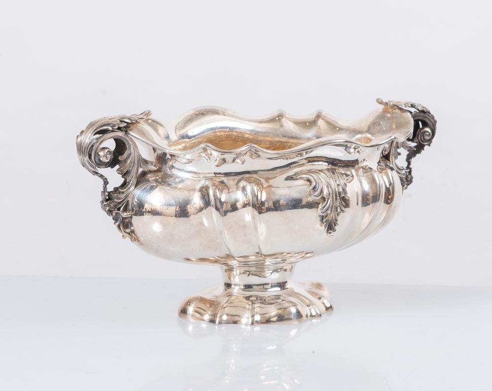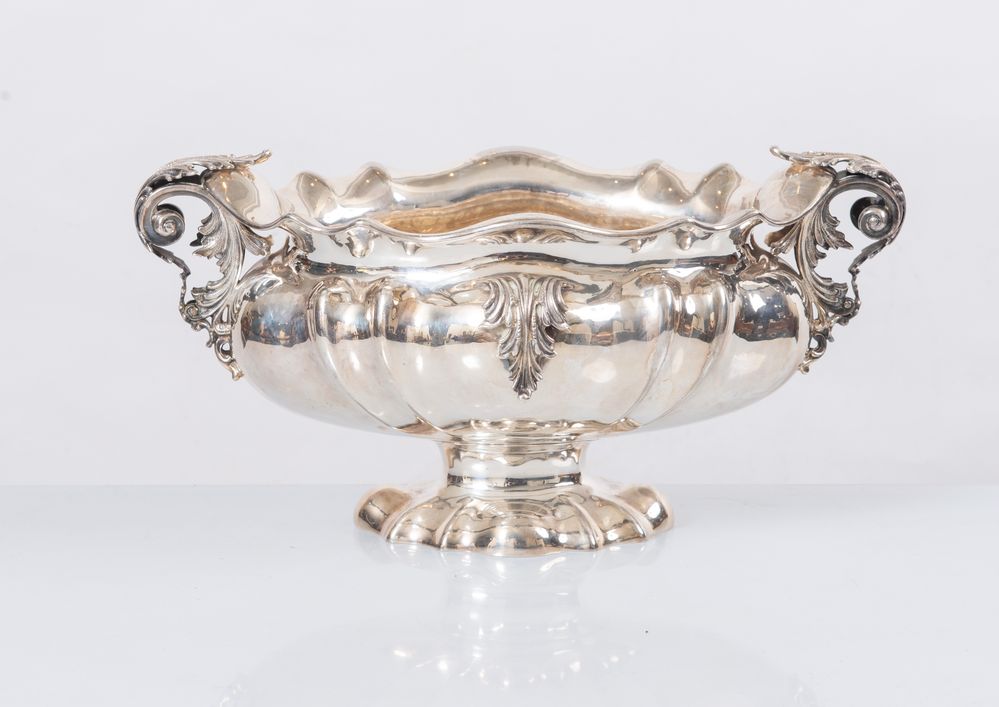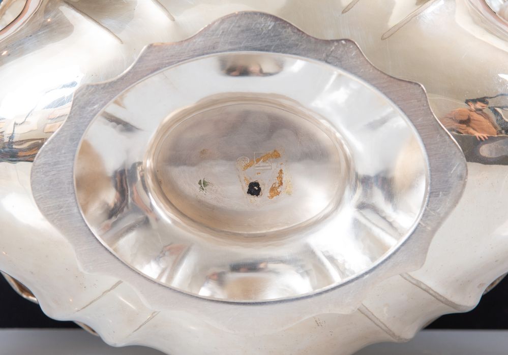 Centro tavola con manici a motivi fogliacei in argento 800. Sotto la base...