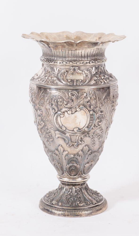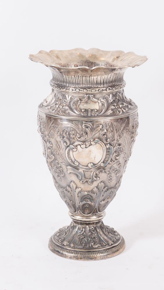 Italia, XX secolo. Importante vaso in argento 800. Sotto la base reca punzoni 800, lavorazione a mano e losanga locativa non identificata. Cm 70x Ø 41. Peso 7450 gr.