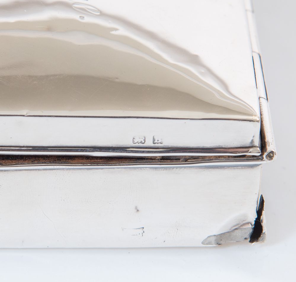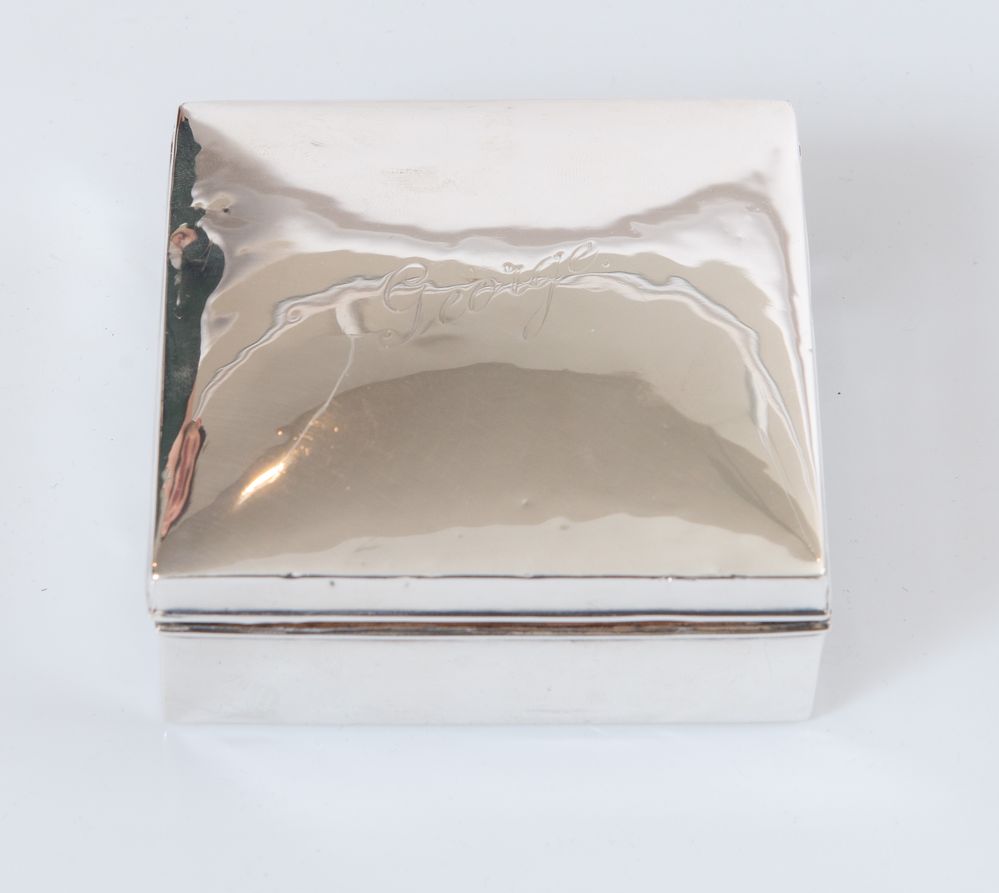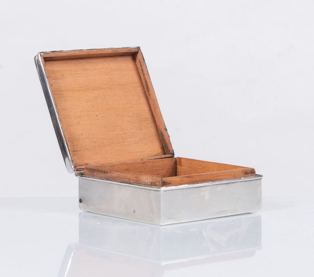 Inghilterra, 1850 (?). Scatola quadrata in argento 925, con interno in legno. Reca punzoni: leone passant e lettera dataria B. Cm 3,5x9x9. Peso complessivo: 300 gr.