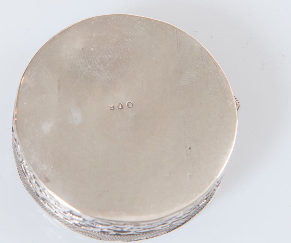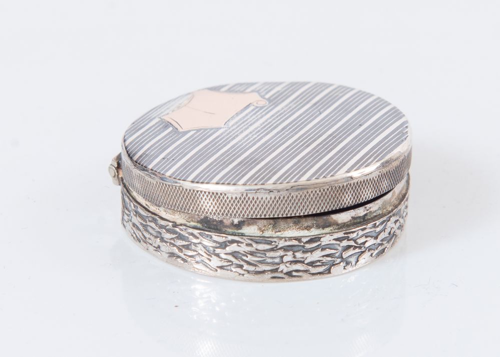 Scatolina piccola rotonda in argento con dettaglio in oro rosa. Ø cm 4,1x1. Peso: 29 gr.