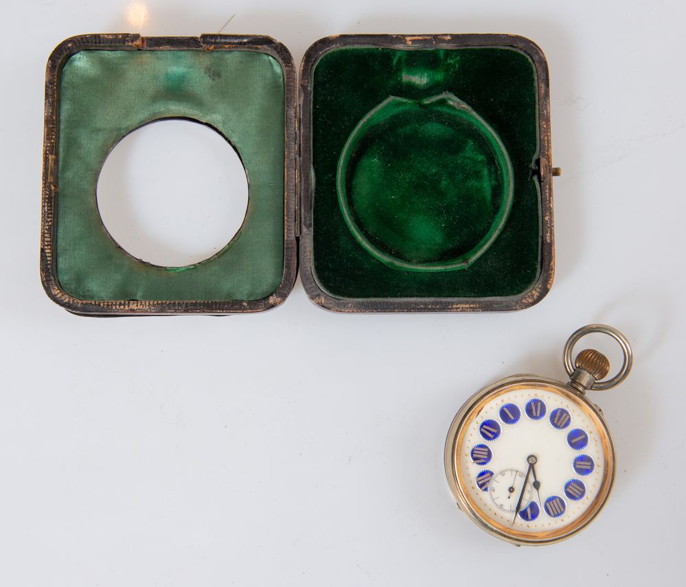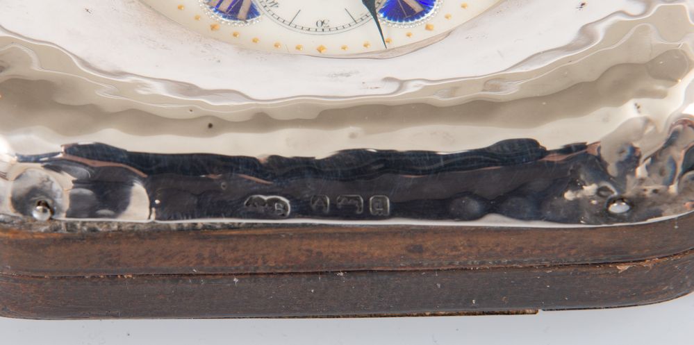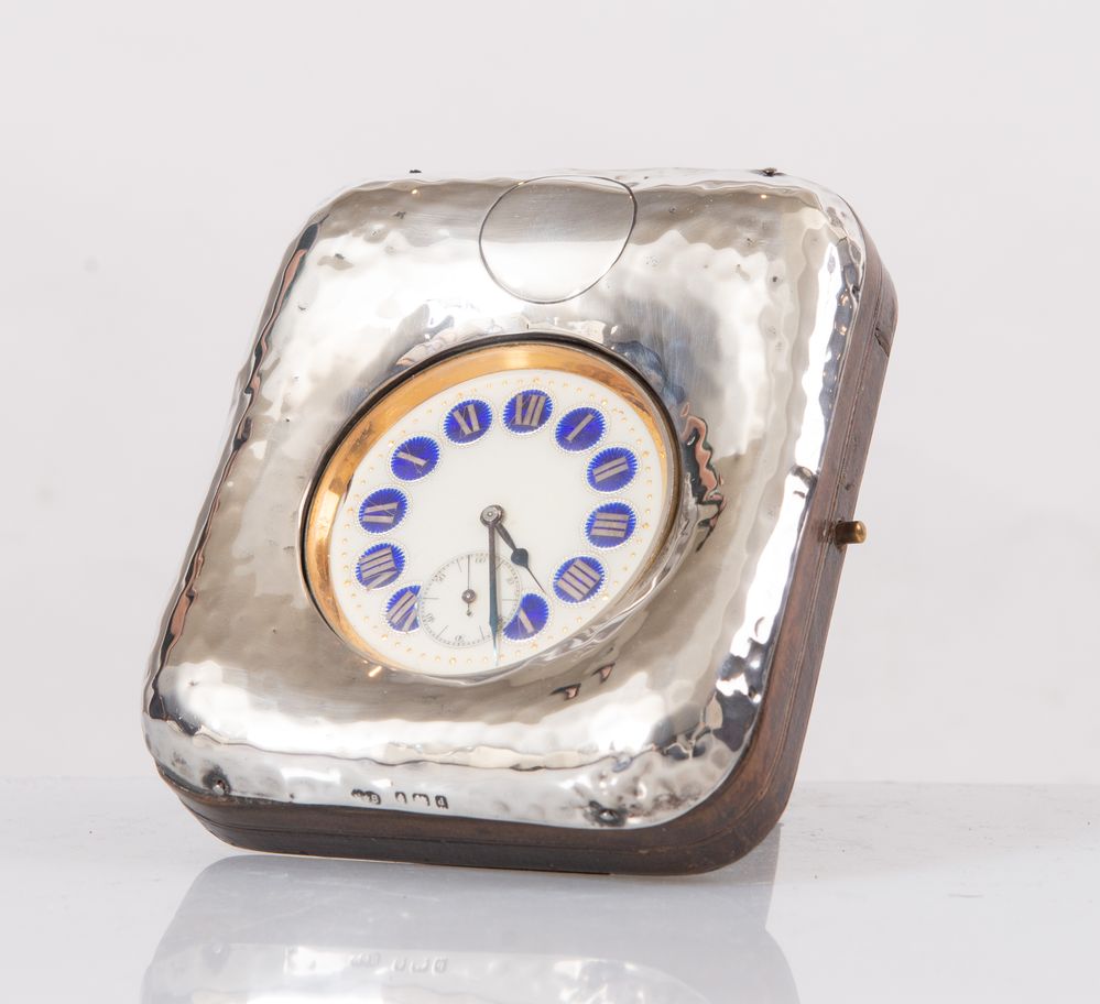 Londra, 1899. Portaorologio in argento 925 e legno. Sul lato reca punzoni: sigla dell'argentiere, leone, leone passant e lettera dataria d. All'interno reca orologio Argentan, Svizzera. Reca numero 316258. Cm 11,5x10x3,5.