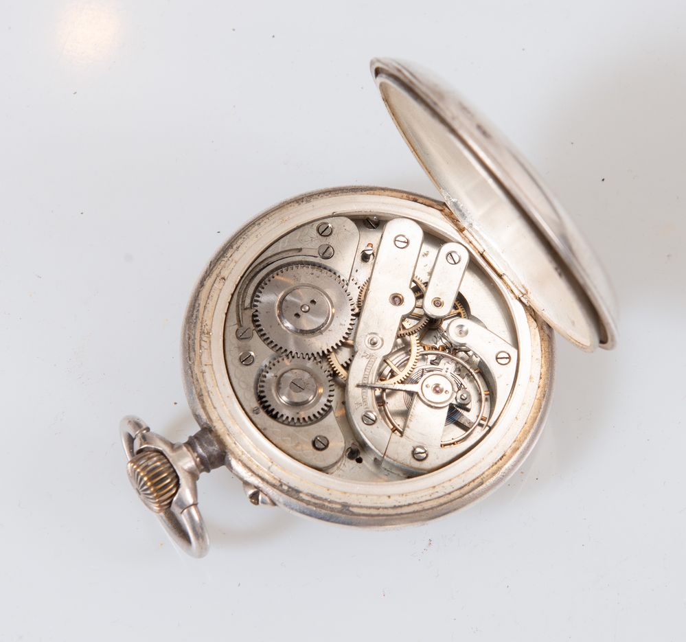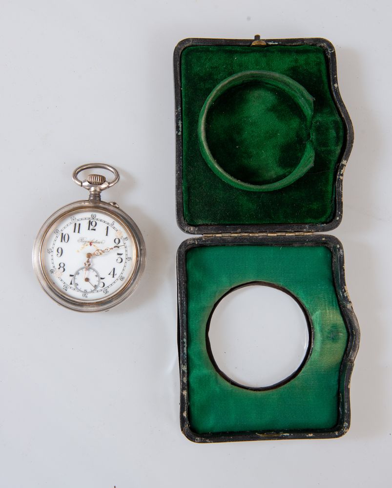 Birmingham, 1913. Portaorologio in argento 925 e legno. Sul lato reca punzoni: sigla dell'argentiere, ancora, leone passant e lettera dataria o. All'interno reca orologio regulateur. Cm 10,7x12x3.