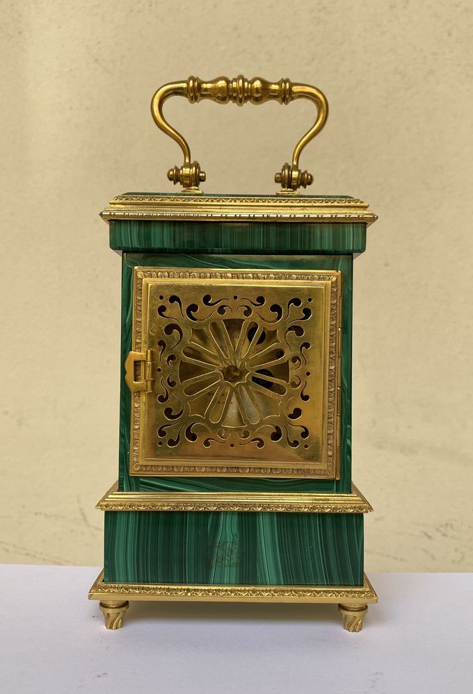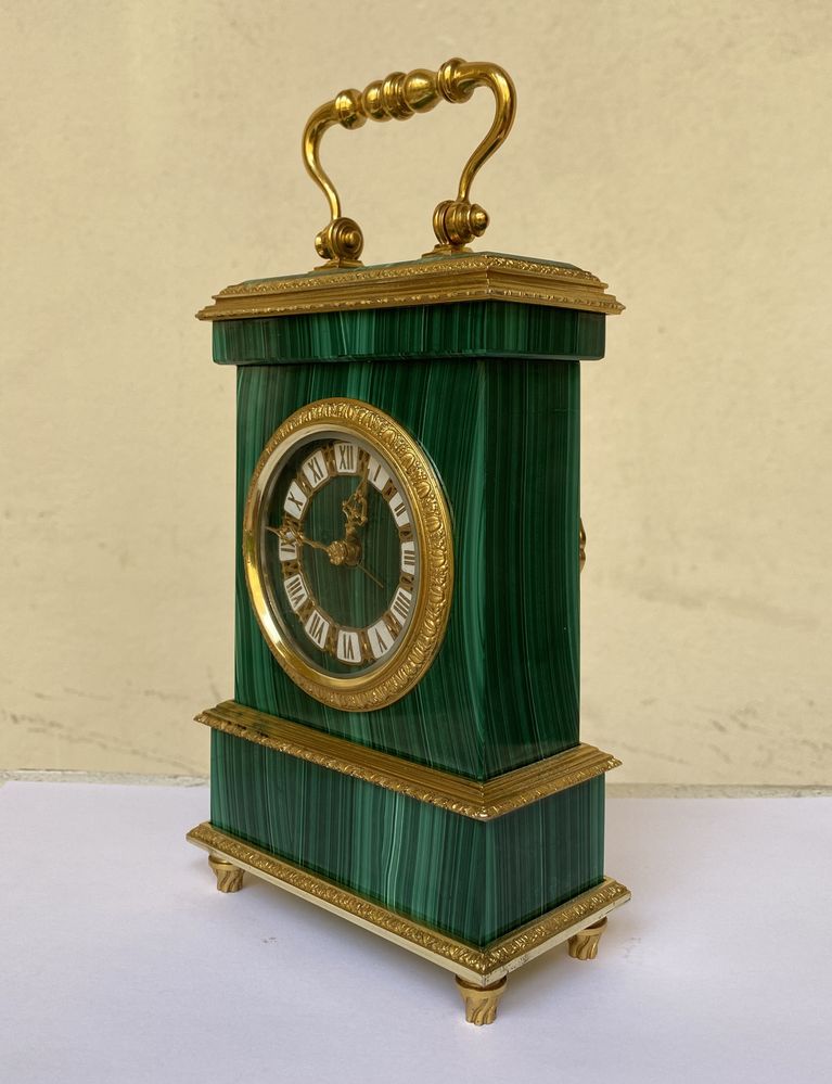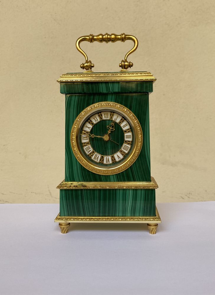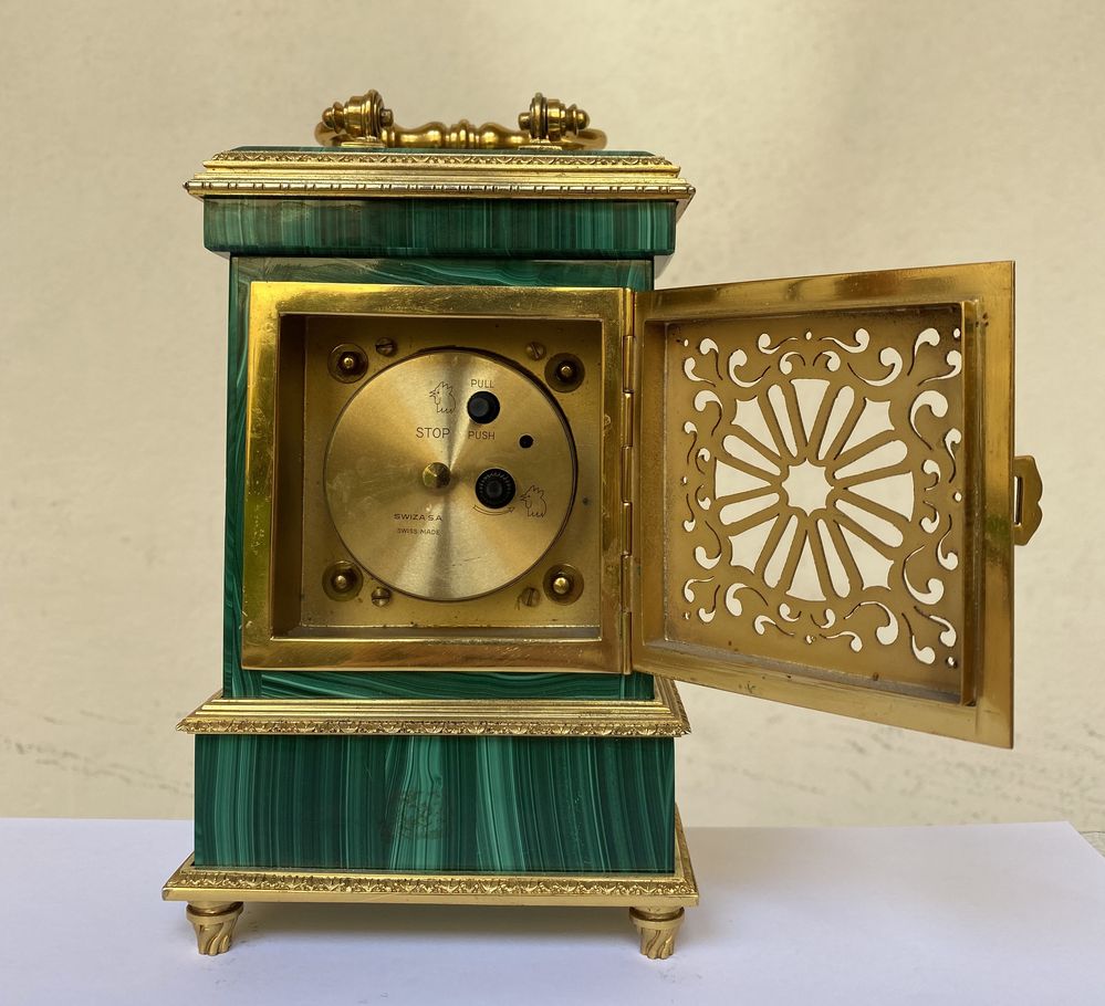 SWIZA S.A., Svizzera. Orologio in argento dorato e malachite. Sotto la base recano punzoni: 800 e losanga locativa non decifrata. Cm 17x10,5x5,5.