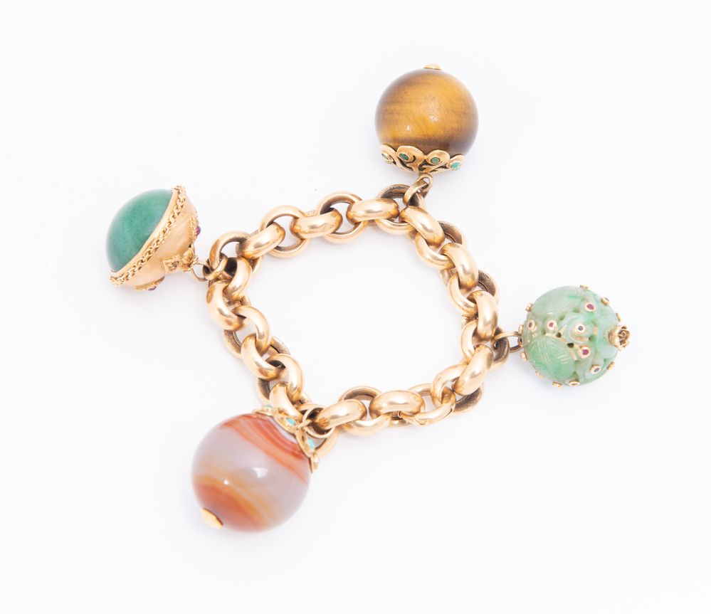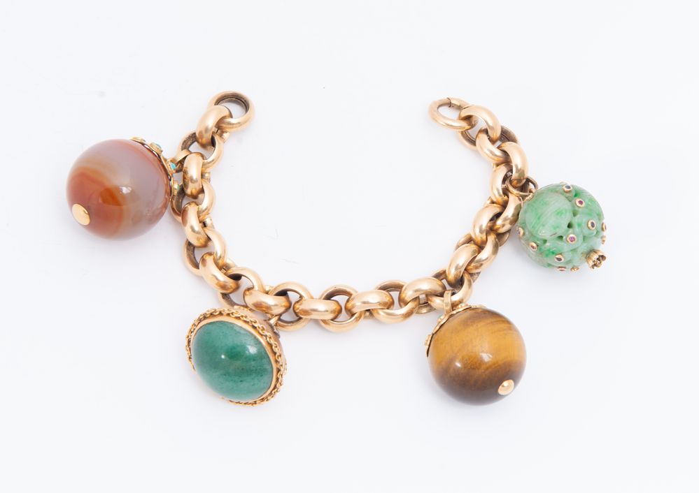 BRACCIALE IN ORO GIALLO E PIETRE SEMIPREZIOSE. Realizzato ad una fila di maglie ovali a cui sono sospese quattro boules in oro e pietre ornamentali semipreziose. Peso complessivo 117,35 grammi.
