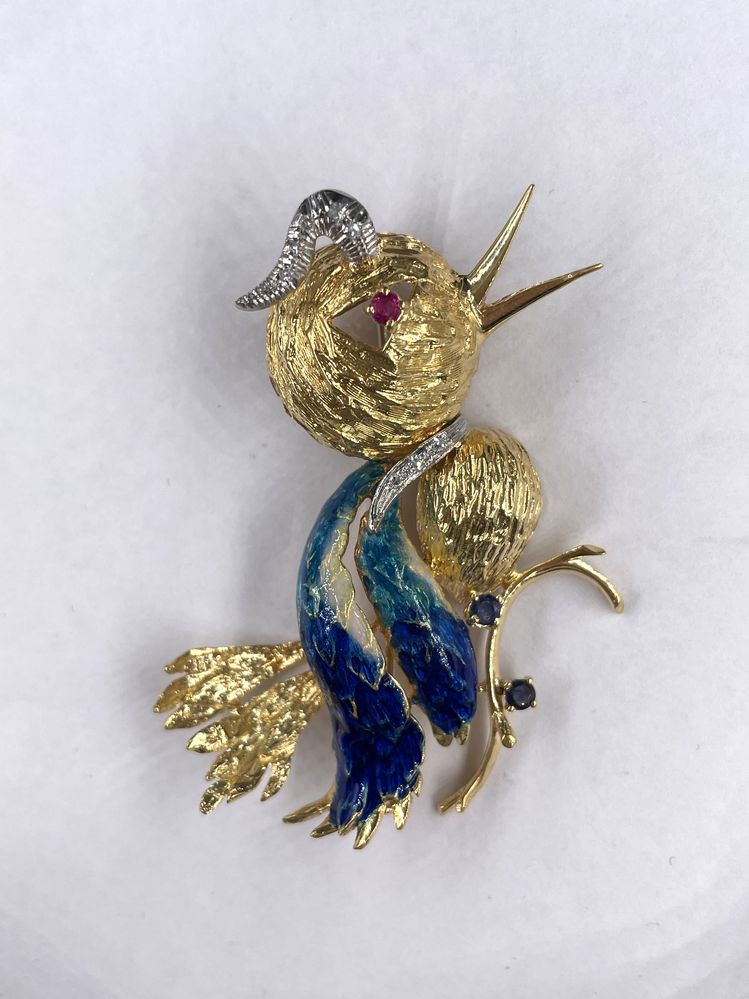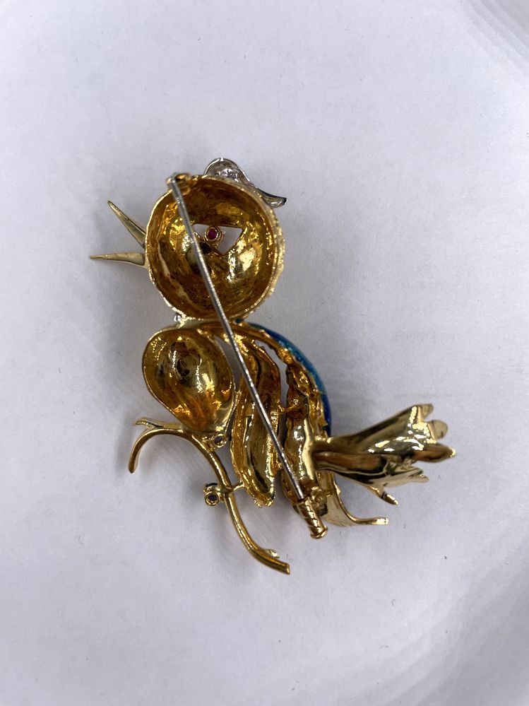 SPILLA IN ORO GIALLO, SMALTI, DIAMANTI E RUBINO. Modellata a foggia di uccellino, con piumaggio in smalti policromi a fuoco, dettagli definiti da piccoli diamanti e un rubino. Peso complessivo 22,67 grammi.