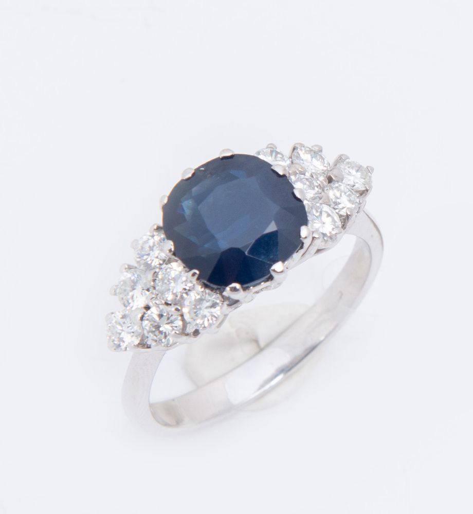 ANELLO IN ORO, ZAFFIRO E DIAMANTI. Realizzato con zaffiro a cuscino sfaccettato di circa 4,00 ct, affiancato ai lati da diamanti per 1,20 ct circa. Peso complessivo 7,23 grammi.