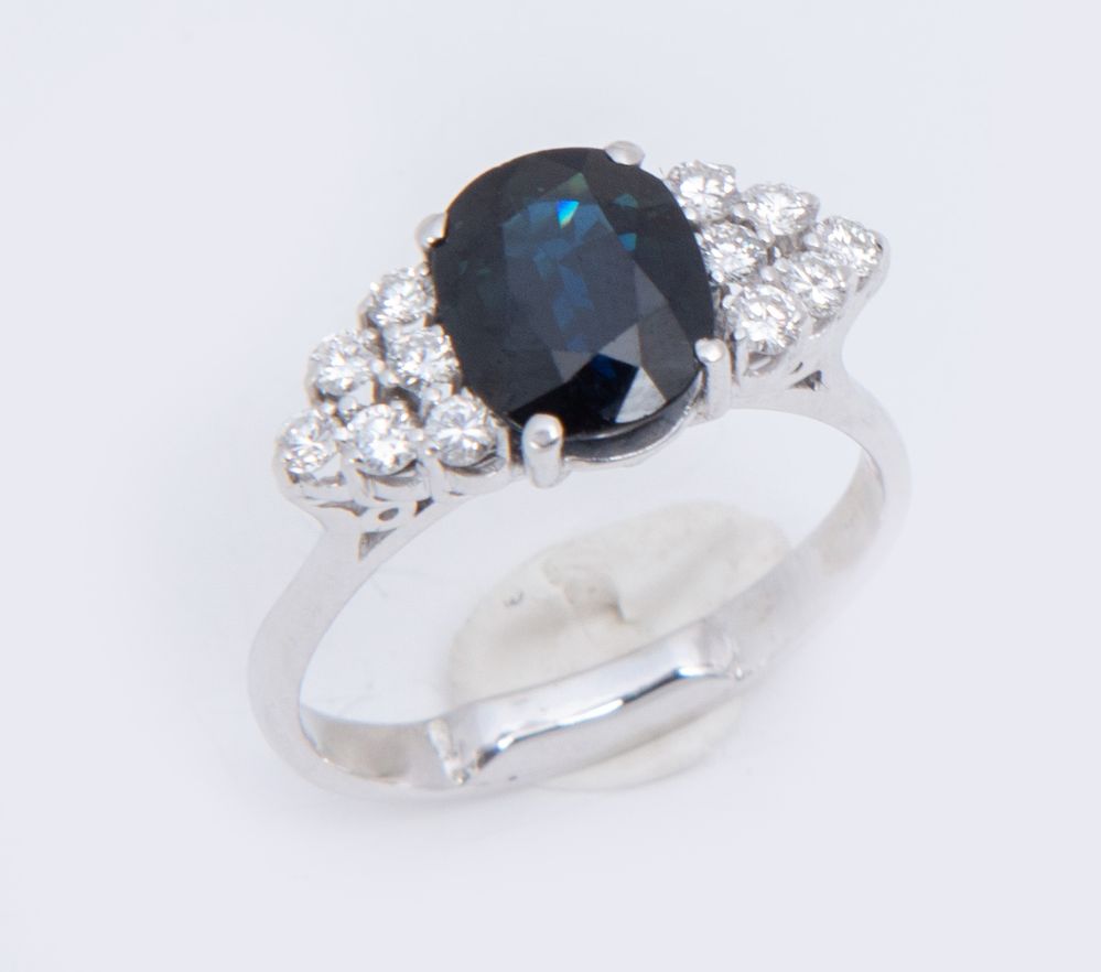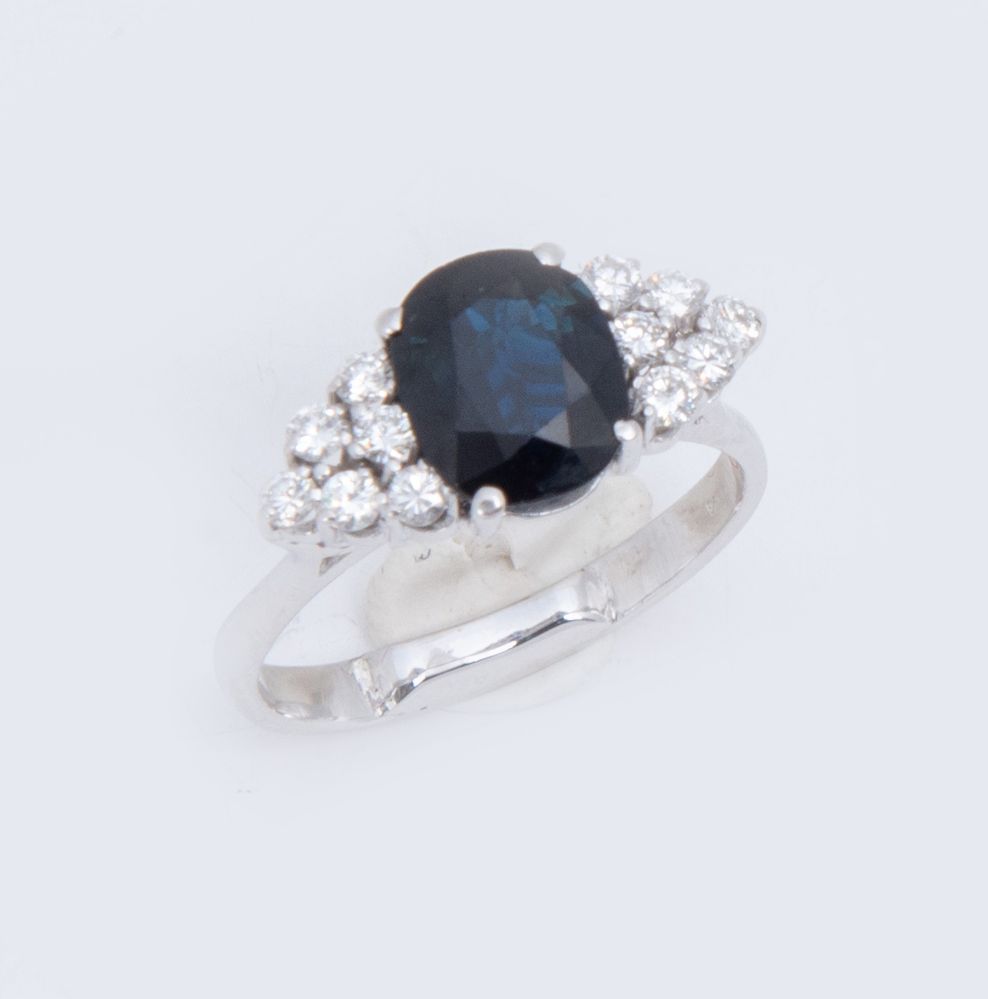 ANELLO IN ORO CON ZAFFIRO E DIAMANTI. Realizzato con zaffiro blu ovale sfaccettato affiancato ai lati da dodici diamanti per 0,60 ct circa. Peso complessivo 5,11 grammi.