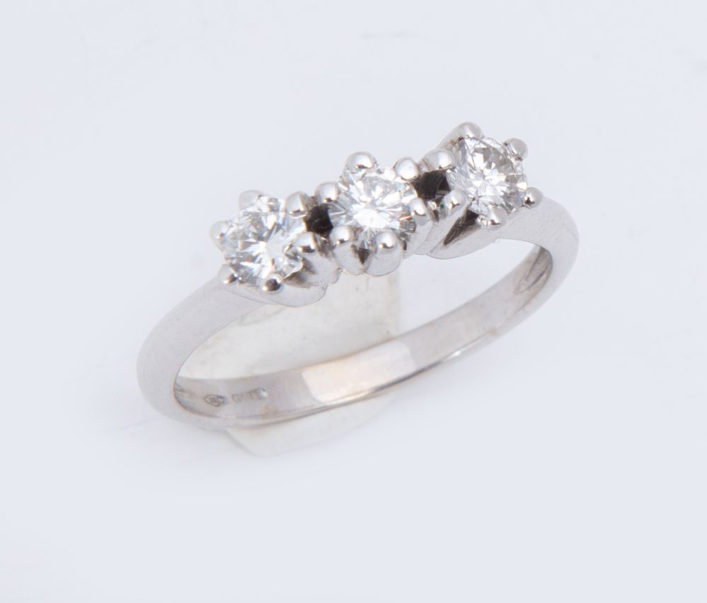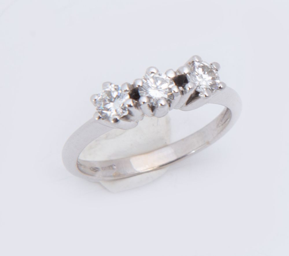 ANELLO TRILOGY IN ORO BIANCO E DIAMANTI. Realizzato ad una linea di tre diamanti rotondi a brillante per un peso stimato di 0,60 ct. Peso complessivo 4,00 grammi.
