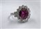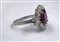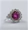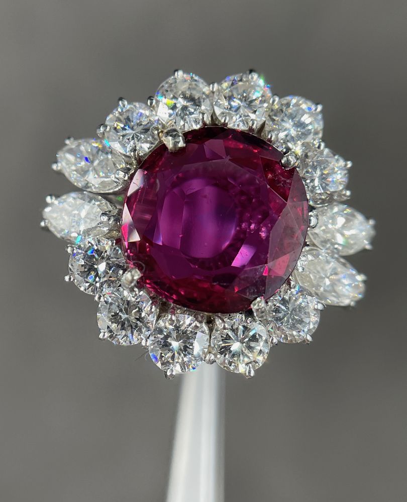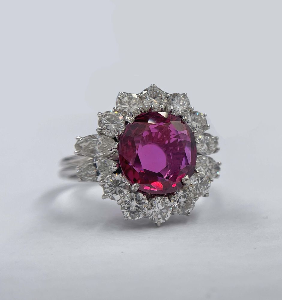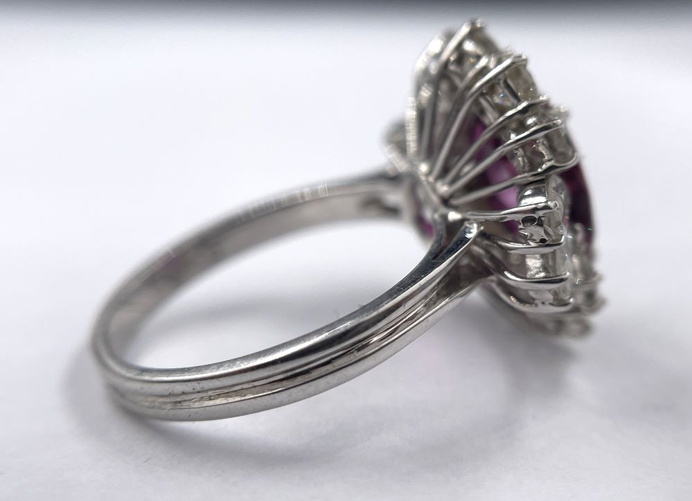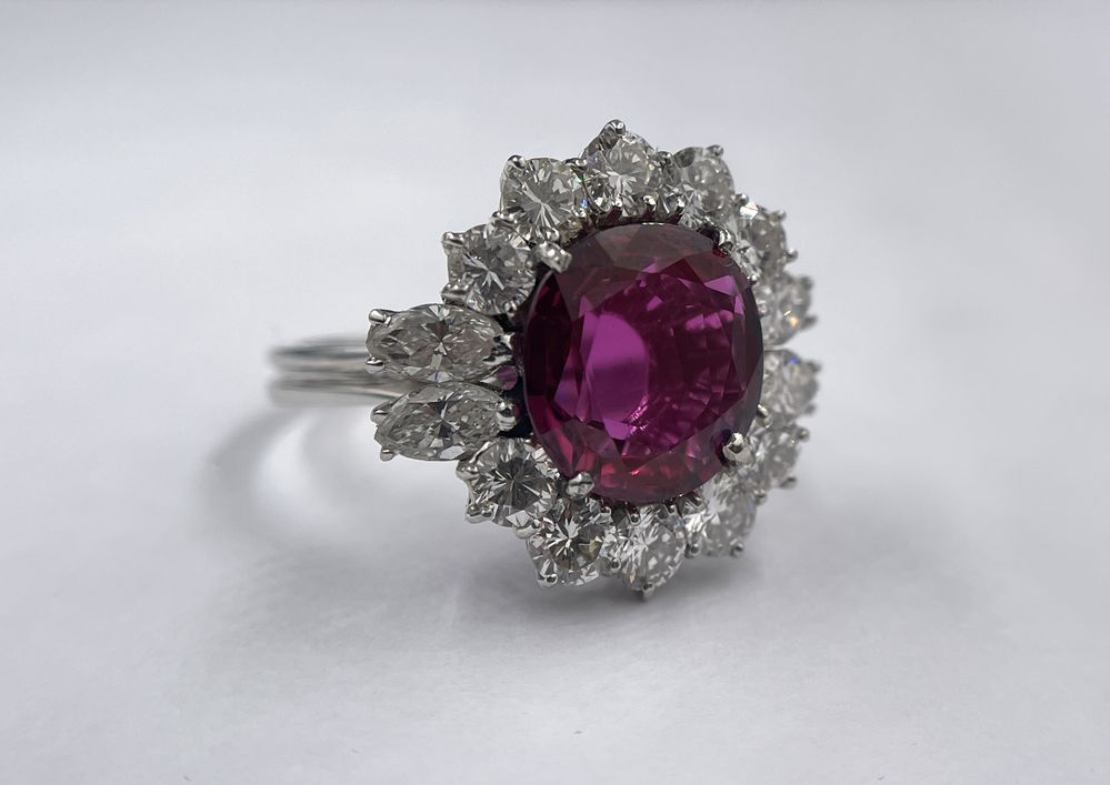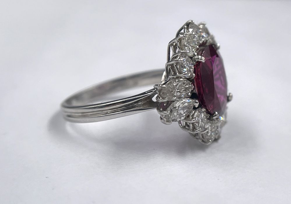 ANELLO IN ORO BIANCO CON RUBINO E DIAMANTI. Realizzato con rubino ovale sfaccettato del peso indicativo di 2,30 ct, probabile origine Thai, posto entro cornice di diamanti rotondi e a navette per un peso stimato di 1,60 ct totali. Peso complessivo: 5,09 grammi.
