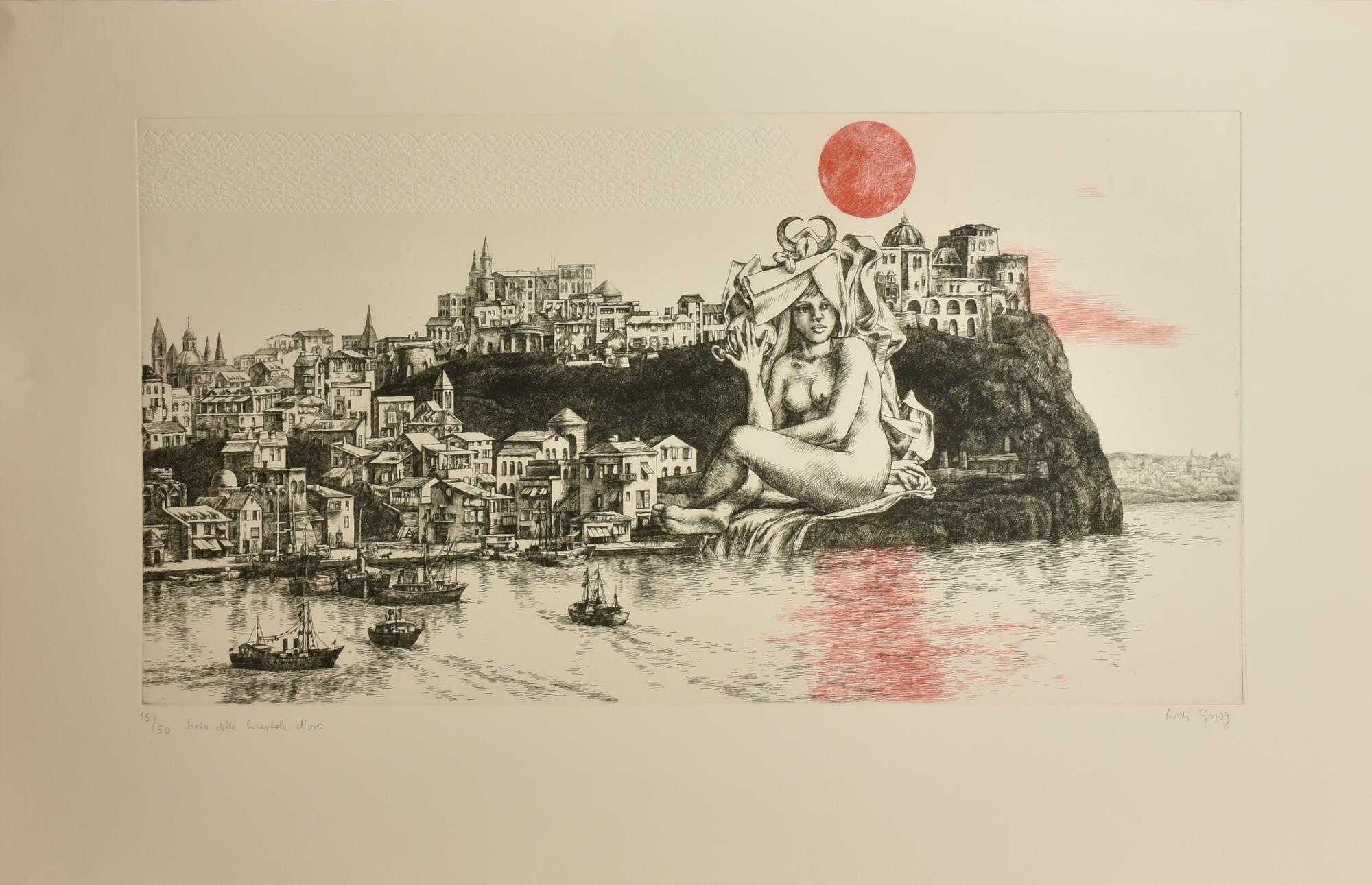 Rudi Gorog ISOLA DELLE LUCERTOLE D'ORO incisione su carta, battuta cm 35,5x...