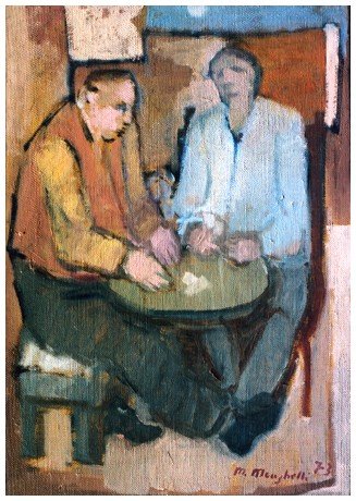 MARCO MENGHELLI Pisa 1948 Giocatori di carte 1973 Olio su tela 40 x 30. Firma e data in b. a d.; sul verso etichetta, firma e timbri galleria Il Navicello, Pisa.