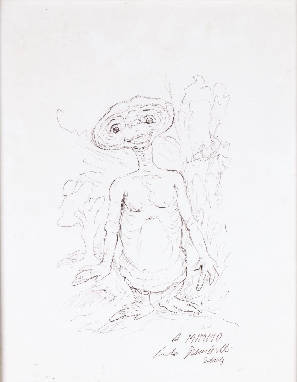 Carlo Rambaldi, acclamato maestro degli effetti speciali cinematografici, e la sua creatura più famosa, ET, protagonista di E.T. the Extra-Terrestrial, storico film diretto da Steven Spielberg nel 1982. Il tenero alieno dimenticato dai suoi compagni sulla Terra è raffigurato in un disegno firmato, datato e dedicato da Rambaldi: “A Mimmo. Carlo Rambaldi 2004”. Disegno, 24 x 34,5 cm
