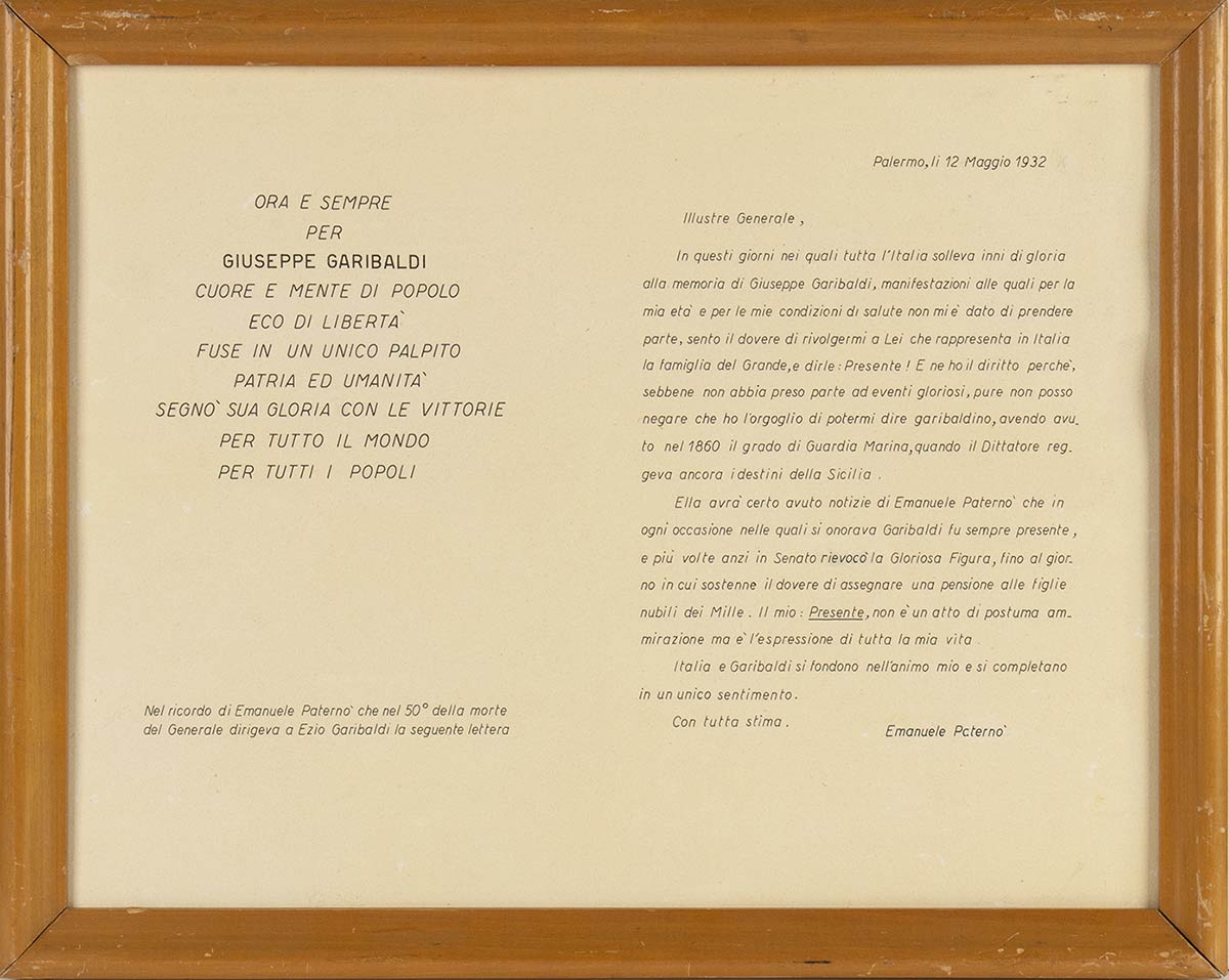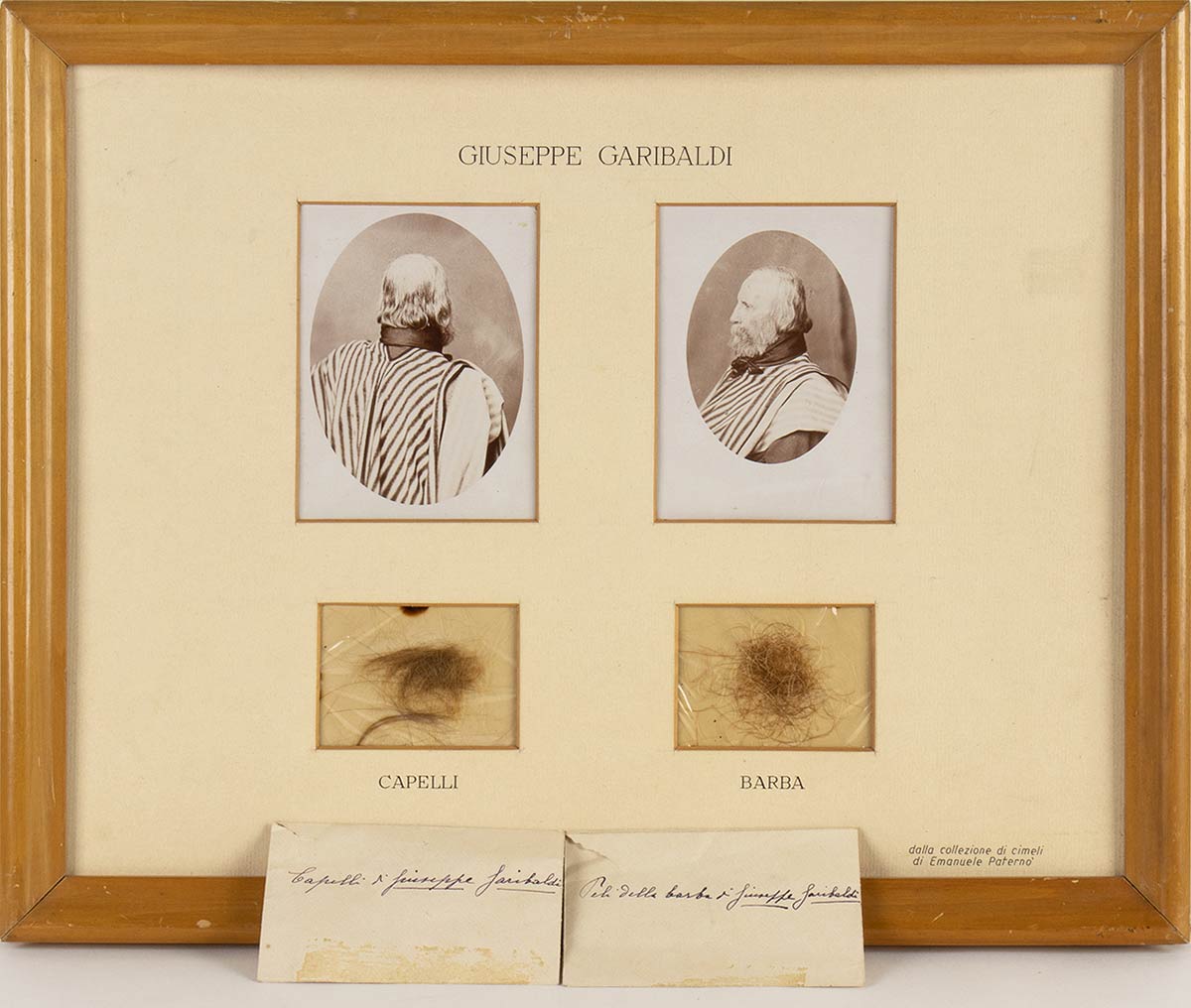 Ciuffi di barba e capelli appartenuti al Generale eroe dei due mondi, Giuseppe Garibaldi, e raccolti come reliquie in cornice entro riquadri protetti da celluloide. Troviamo anche due magnifiche foto molto rare di Garibaldi, e le buste originali che contenevano i peli. Un secondo quadretto riporta la dedizione e devozione a Garibaldi, con copia di lettera inviata a Enzo Garibaldi. Misure dei quadretti cm.45x36. Buone condizioni.