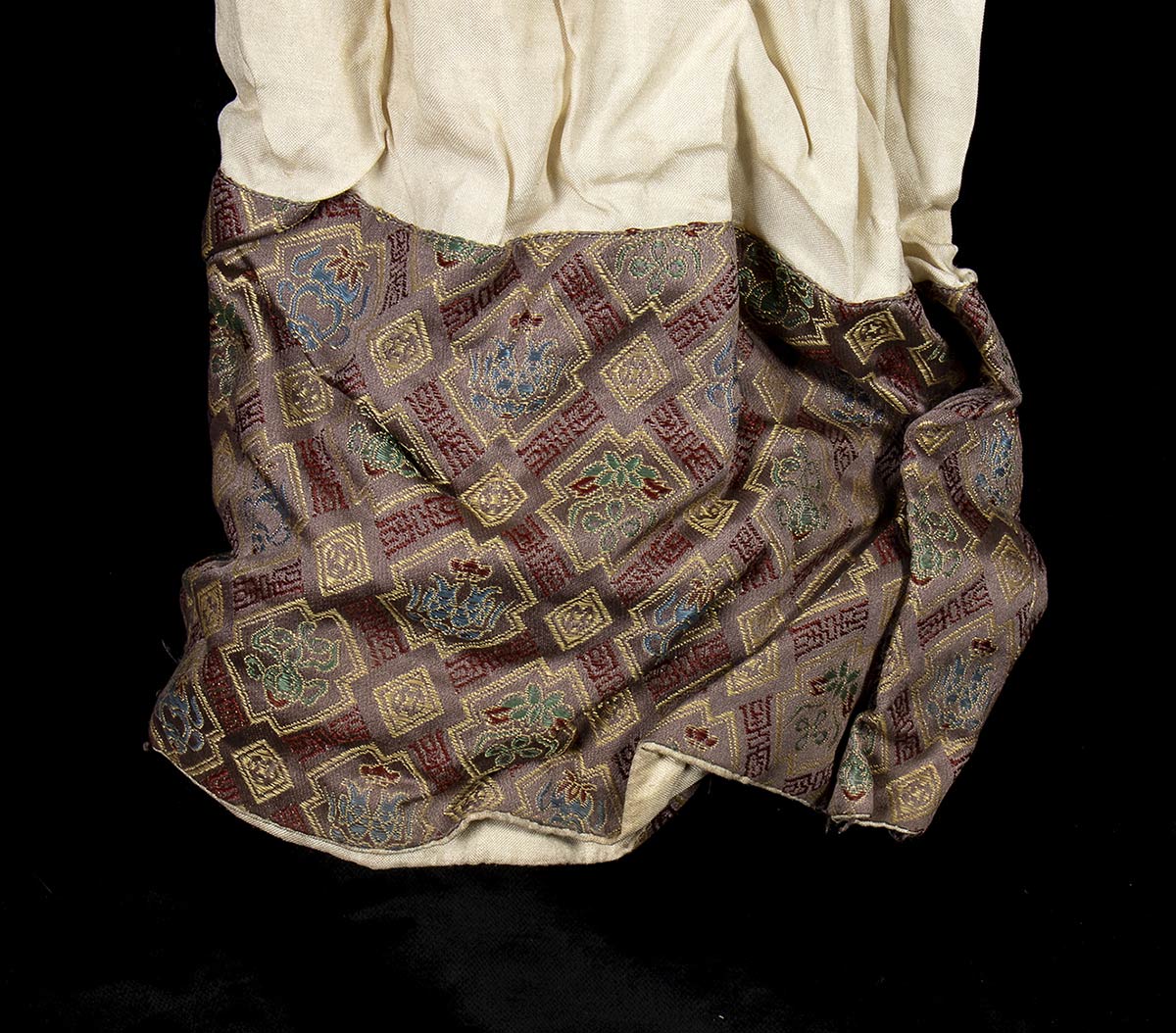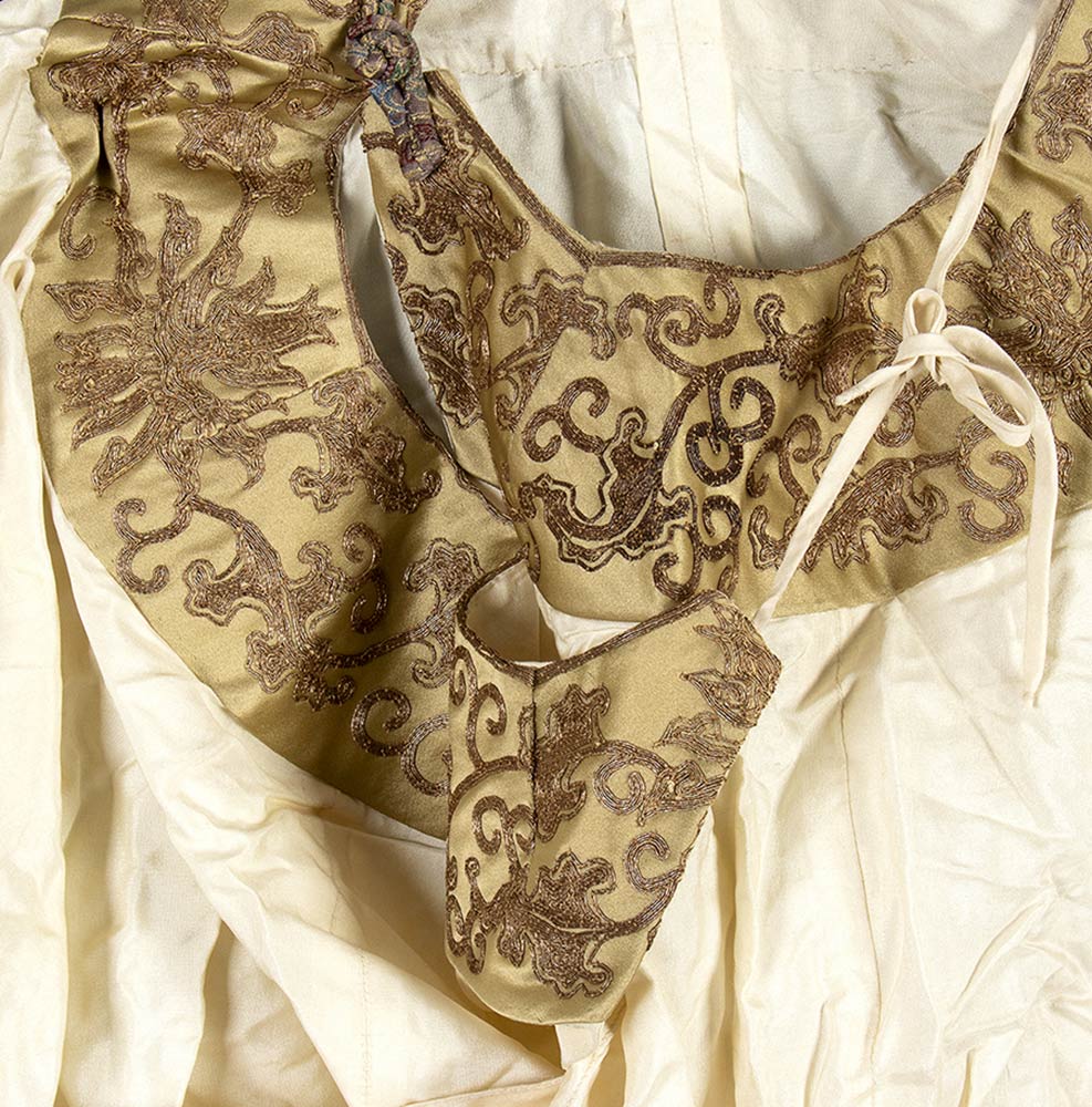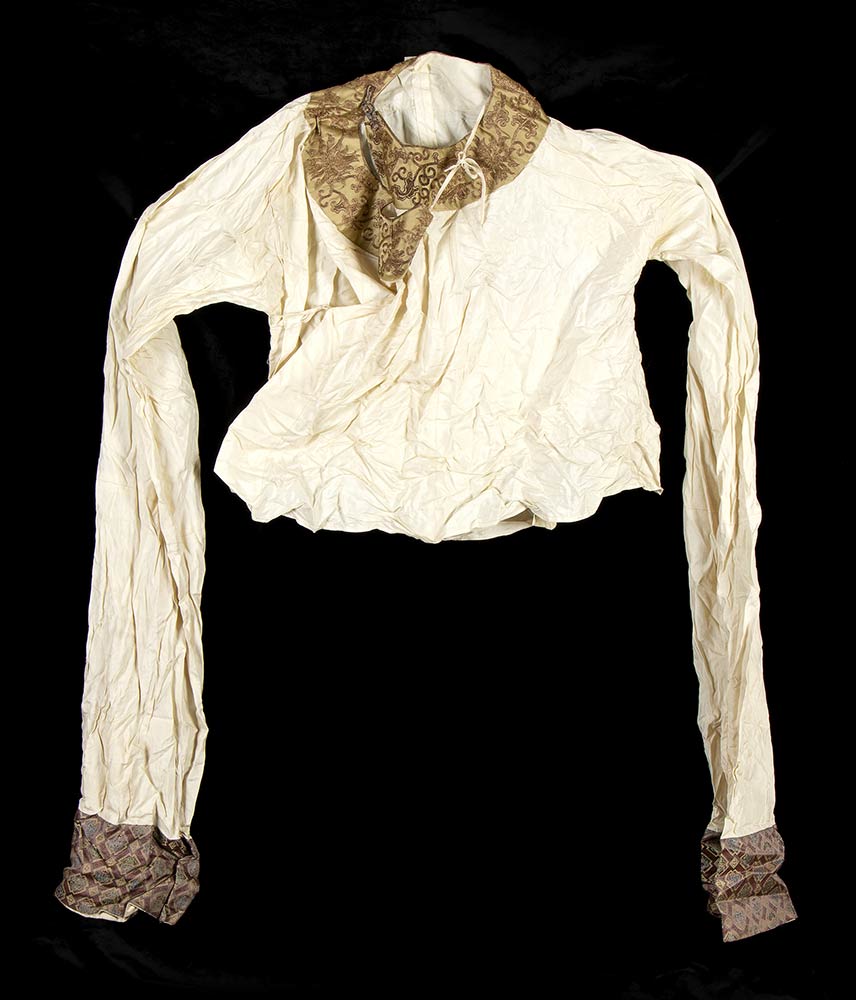 Camicia in cotone bianco con applicazioni in raso e ricami in filo dorato, parte di costume di scena usato sul set del film L'ULTIMO IMPERATORE per la regia di Bernardo Bertolucci, del 1974. Lunghezza manica circa cm.110. Da stirare, ottime condizioni