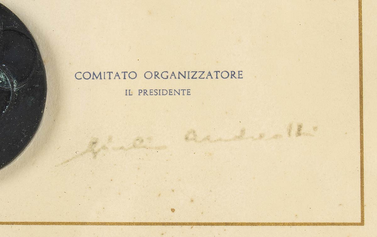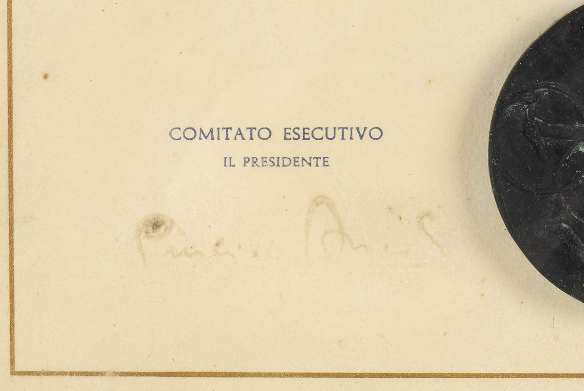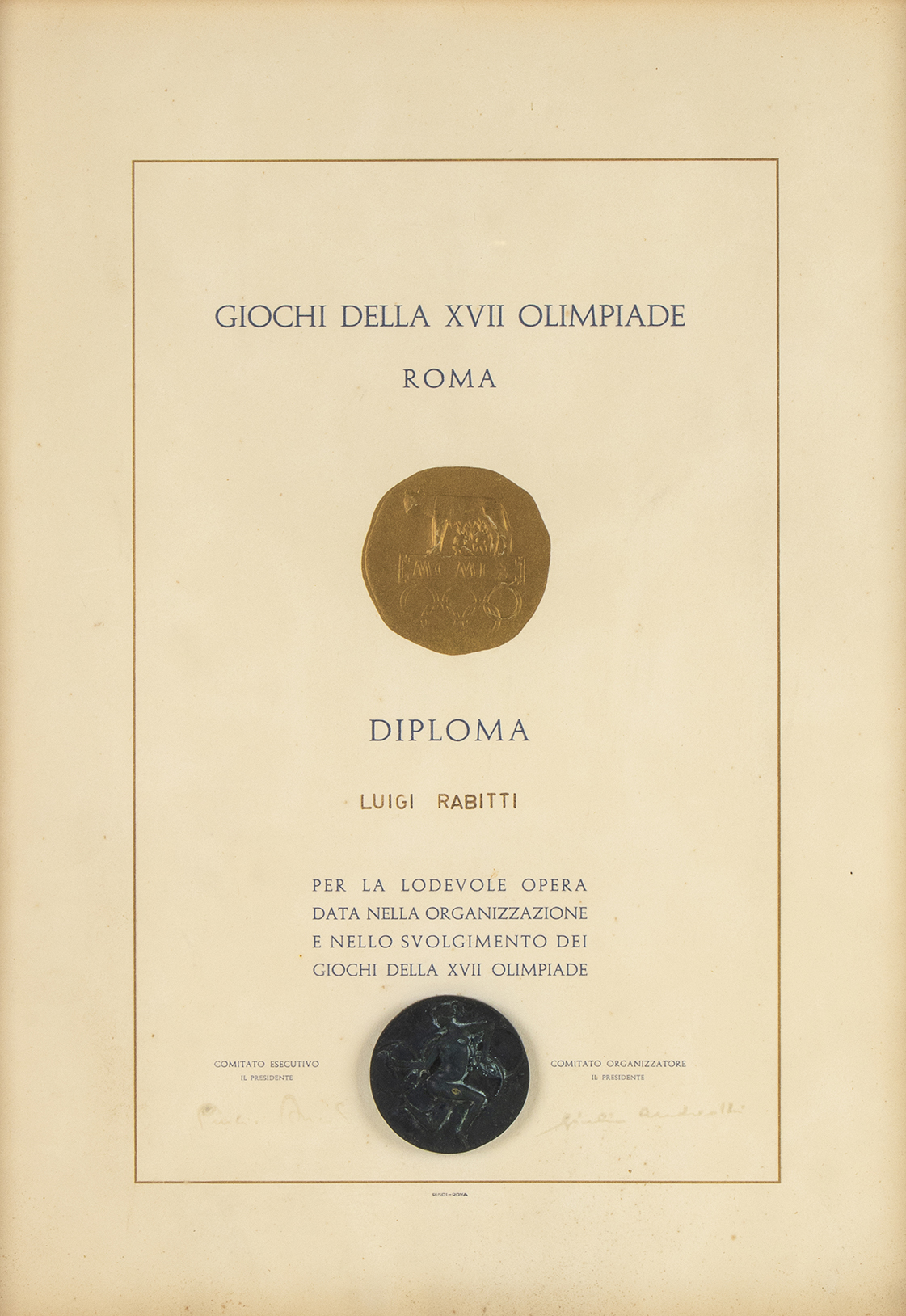 Attestato e medaglia in bronzo (disegnata da Emilio Greco) per partecipanti e staff ai GIOCHI DELLA XVII OLIMPIADE di Roma del 1960. L'attestato è firmato in basso da GIULIO ANDREOTTI, presidente del Comitato Organizzatore (CIO), e da GIULIO ONESTI presidente del Comitato Esecutivo. Il tutto entro cornice e vetro d'epoca. Medaglia perfetta, diametro mm.50, misure dell'attestato cm.39x36, firme scolorite. In buone condizioni