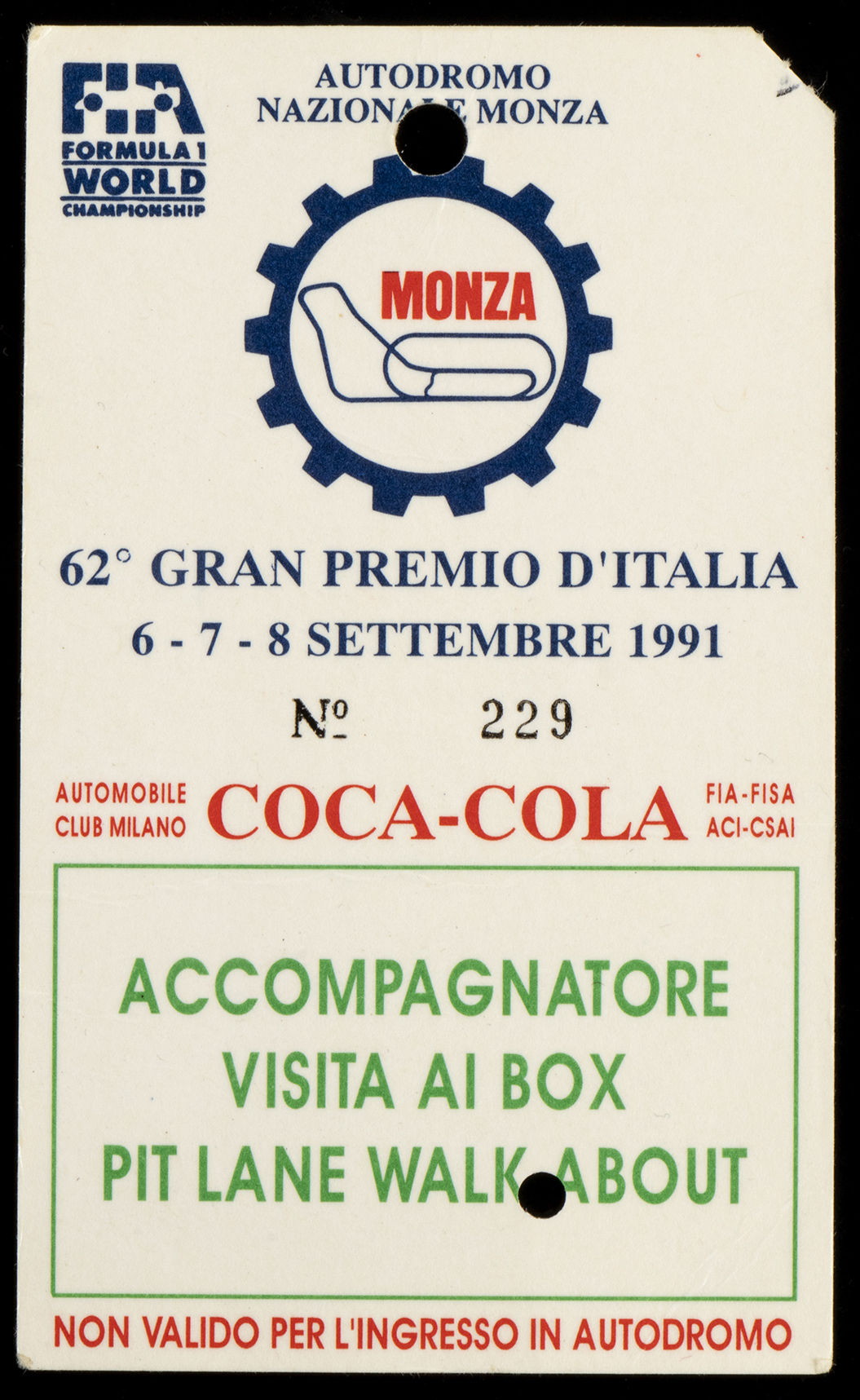 Biglietto usato del 62' Gran Premio d'Italia Autodromo di Monza del 1991 per ACCOMPAGNATORE VISITA AI BOX - PIT LANE WALK ABOUT con autografo originale in inchiostro nero di AYRTON SENNA (leggi Ayrton Senna 91)