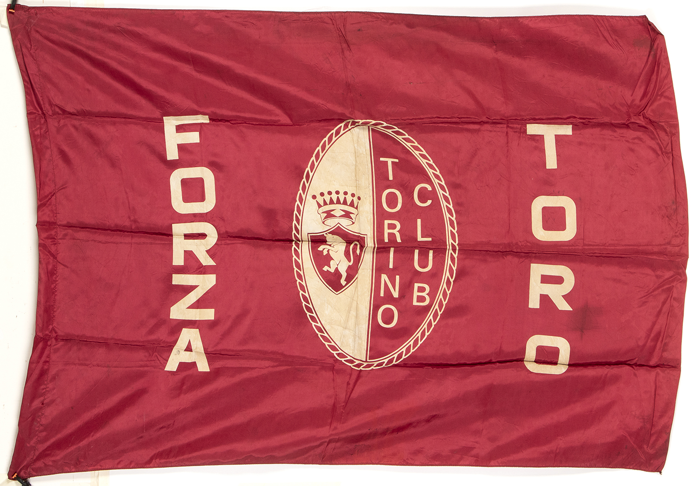 Bandiera del TORINO CLUB , in stoffa di raso, colore granata, con simbolo del TORINO Football Club e slogan FORZA TORO stampati a colore bianco. Anni 70/80. Monofaccia. Misure circa cm. 90x125. Pieghe. Buone condizioni