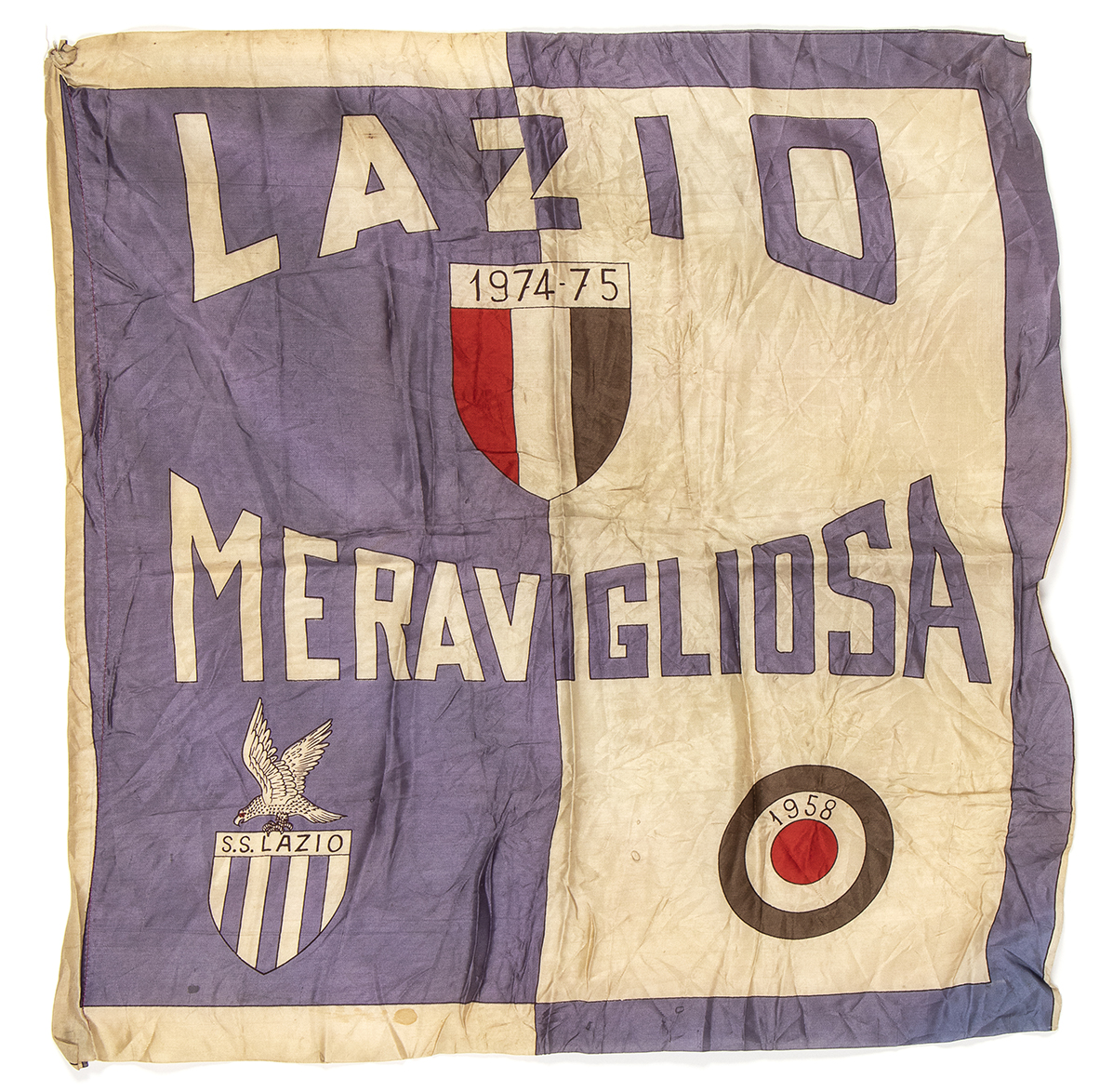 Bandiera della LAZIO Società Sportiva calcio, celebrativa dello scudetto del 1974-75. Stampa su raso. Misura circa cm.65x68. Pieghe varie. Buone condizioni