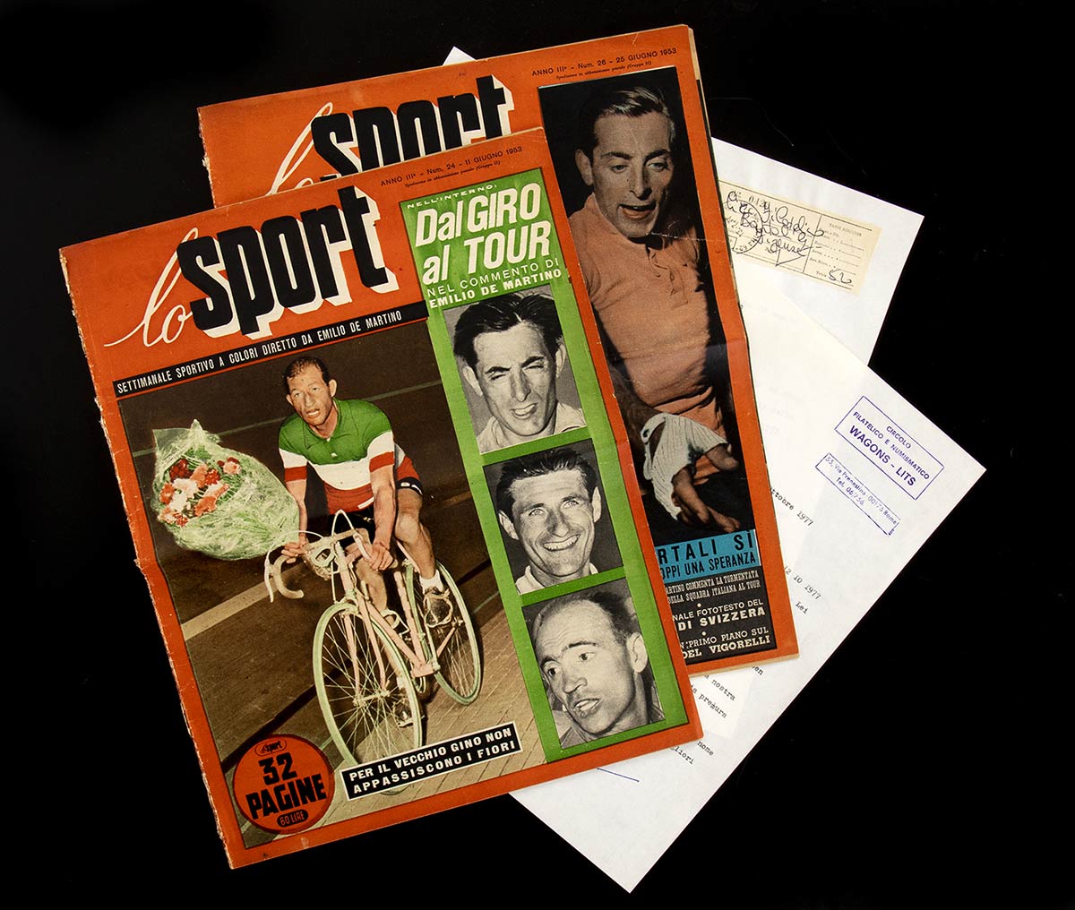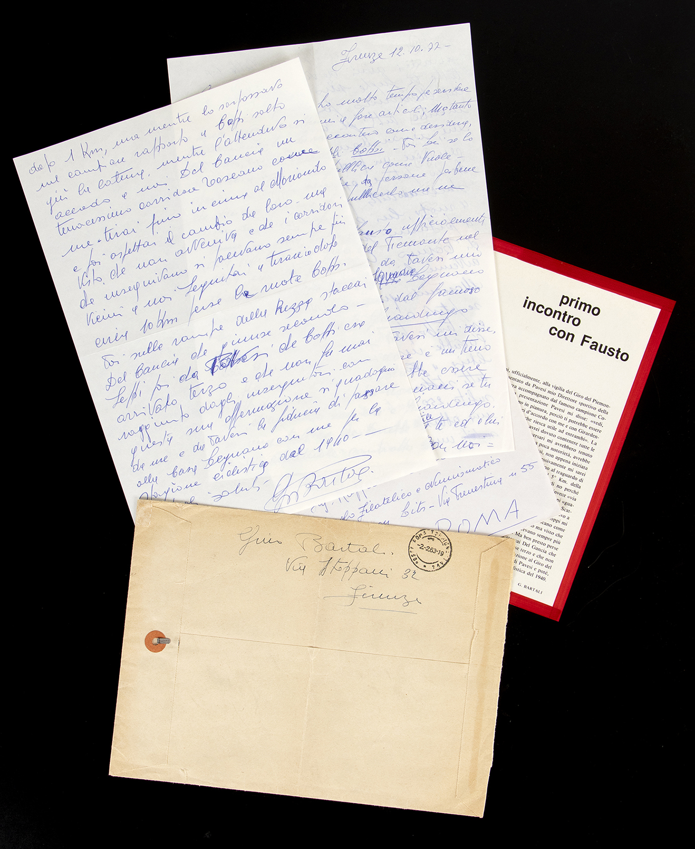Lettera originale scritta di pugno da Gino Bartali, il 12 Ottobre 1977, ed indirizzata ad un collezionista e presidente di circolo filatelico, che doveva scrivere un articolo su Bartali e su come conobbe Fausto Coppi. La lettera scritta su due fogli per tre facciate, racconta in sintesi per mano diretta ed autografa di Gino Bartali, come avvenne che Coppi e Bartali si conobbero. Esordisce dicendo "Io non ho molto tempo per scrivere e tanto meno mettermi a fare articoli. Ma tanto per accontentarla come desidera, qui sotto, COME CONOBBI COPPI. Poi lei se lo rimetta a posto e lo pubblichi come vuole, sperando come sempre, da persona perbene che appena finisce di pubblicarlo me ne manderà una copia. Cordiali saluti ..." Il racconto prosegue con dettagli e anedotti singolari, ovviamente sinceri e veri. Nel lotto troviamo lettera di richiesta a Bartali, busta autografa di risposta, altra busta del 1963, ed alcune riviste sportive. Formato fogli A4. Buone condizioni