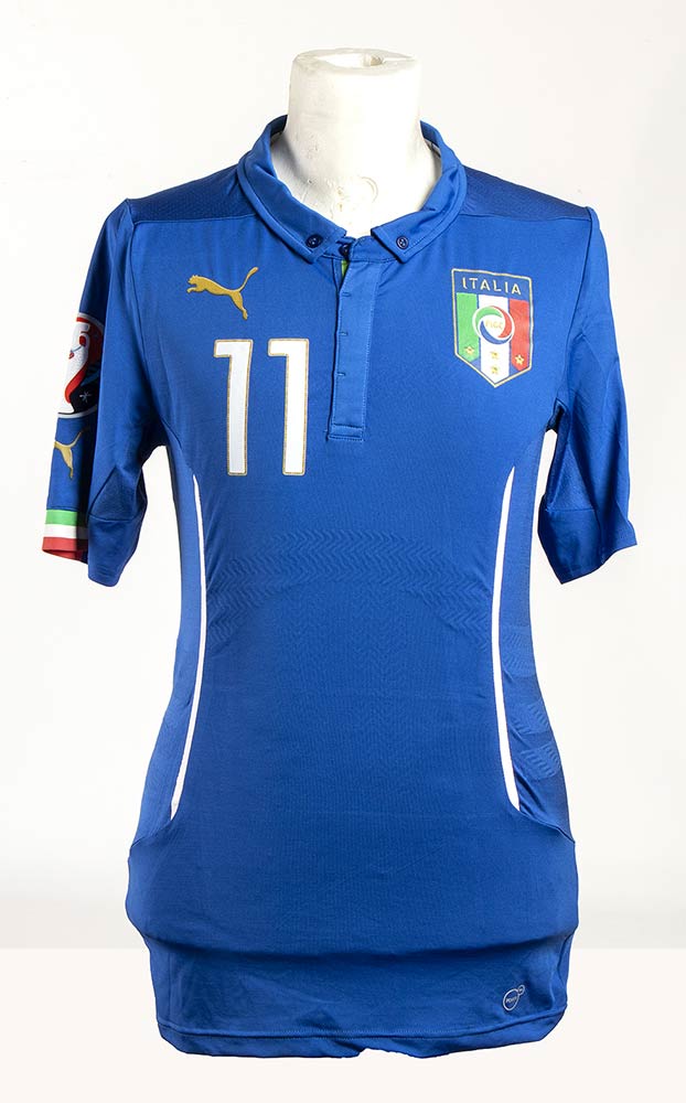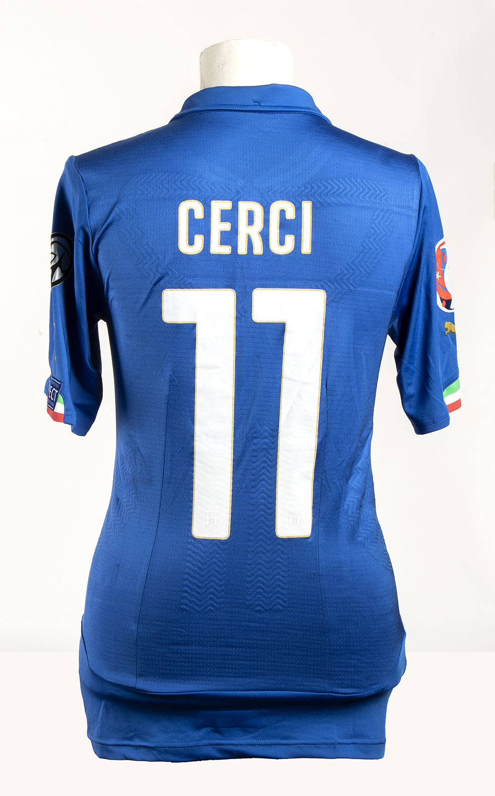 Maglia di gara Puma, a maniche lunghe. Preparata per Alessio Cerci, dopo le convocazioni di qualificazione ad EURO 2016. Sulla manica destra patch in materiale plastico EURO 2016. Al petto numero 11 e stemma della FIGC applicati. Al retro nome CERCI e numero 11 applicati. Sulla manica sinistra patch UEFA EURO 2016 RESPECT. Power-Cell, TRADIZIONE FORZA AZZURRI. In perfette condizioni