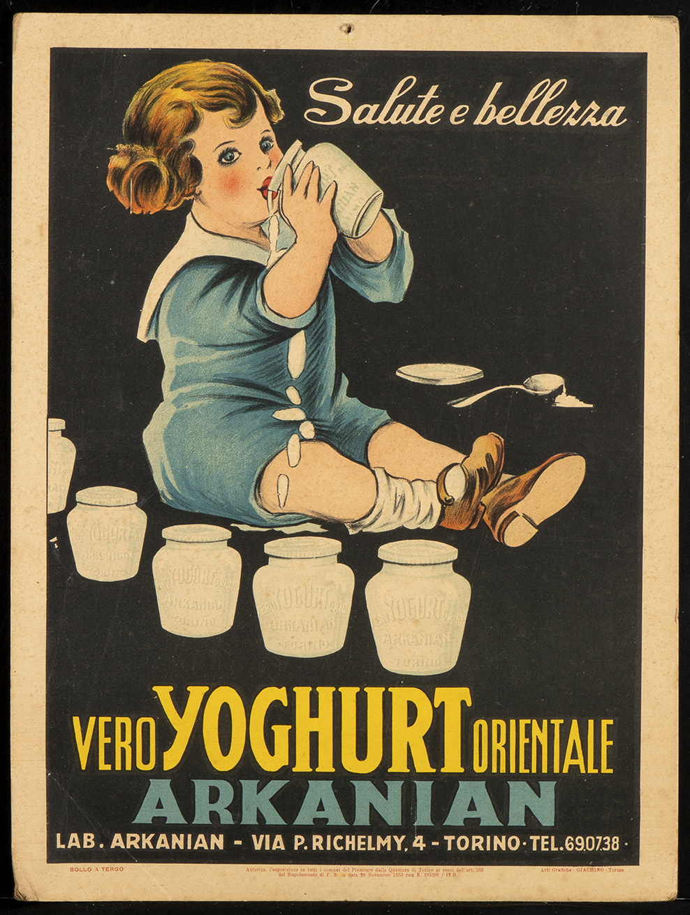 Cartoncino VERO YOGHURT ORIENTALE ARKANIAN - SALUTE E BELLEZZA. Arti grafiche Giachino, Torino. Originale, 1953. Misure cm.30x40. Condizioni B