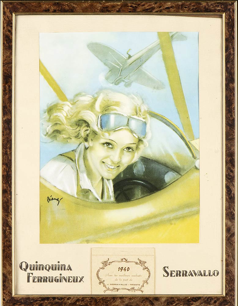 Bella locandina cartonata della QUINQUINA FERRUGINEUX SERRAVALLO con calendarietto annesso, per l'anno 1940, edizione francese. In cornice. Originale. Misure cm. 33x43. Condizioni B