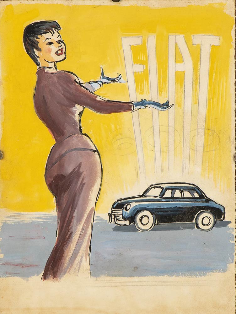 Prova di disegno pubblicitario, acquarello su carta, per automobili FIAT. Donna in tailleur che ammira lo splendore della nuova FIAT. Non firmato. Misure cm.19x25. Condizioni B