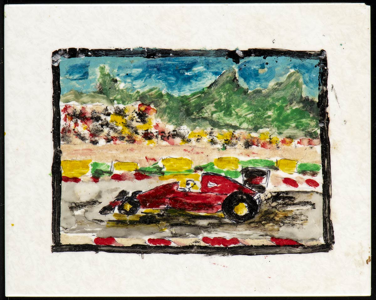 Auto da corsa F1, probabilmente una Ferrari, dipinta su maiolica in ceramica. Anni '90. Misure cm. 25x19. Condizioni medie